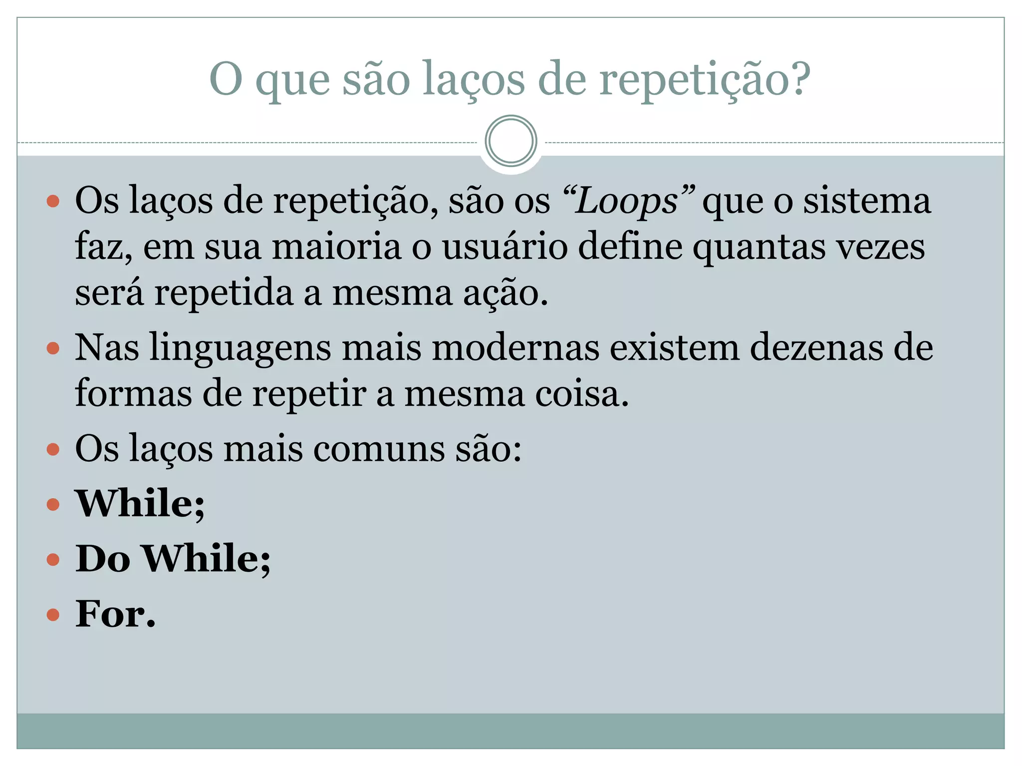 Os laços de repetição permitem executar repetidamente uma sequência de instruções. Os laços mais comuns são while, do while e for. While repete enquanto uma condição for verdadeira, do while sempre executa pelo menos uma vez, e for define inicialização, condição e incremento de variáveis.