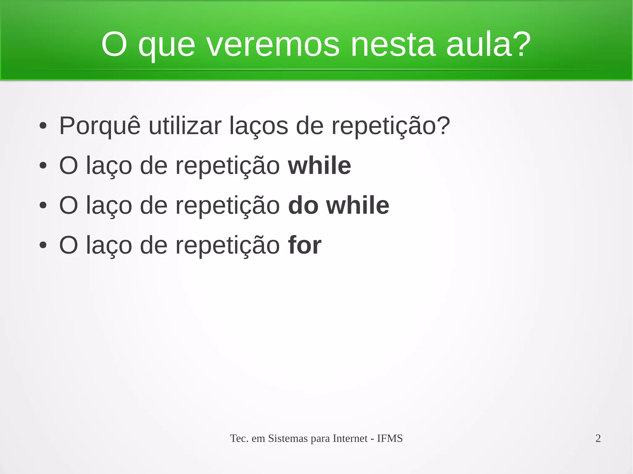 A aula apresenta diferentes tipos de laços de repetição em programação, como while, do while e for. Os laços permitem repetir trechos de código de forma automática e são úteis para resolver problemas que envolvem sequências ou repetições. Exemplos de código são fornecidos para mostrar como imprimir sequências numéricas usando cada tipo de laço.
