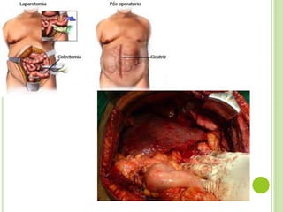 A laparotomia é uma incisão cirúrgica na parede abdominal utilizada para explorar, diagnosticar ou tratar doenças desconhecidas ou extensas. O procedimento envolve várias etapas, incluindo a abertura da cavidade, avaliação das patologias e fechamento após a cirurgia. Complicações podem incluir infecções e problemas associados a anestesia, além de cuidados pós-operatórios focados na prevenção de infecções e monitoramento de sinais vitais.