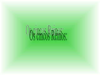 O documento descreve os cinco reinos biológicos: Animal, Vegetal, Fungi, Monera e Protista. O Reino Animal inclui animais e seres humanos que são pluricelulares e heterotróficos. O Reino Vegetal inclui plantas fotossintéticas pluricelulares. O Reino Fungi inclui cogumelos unicelulares ou pluricelulares que se reproduzem por esporos e são heterotróficos por absorção. O Reino Monera inclui bactérias procariontes unicelulares