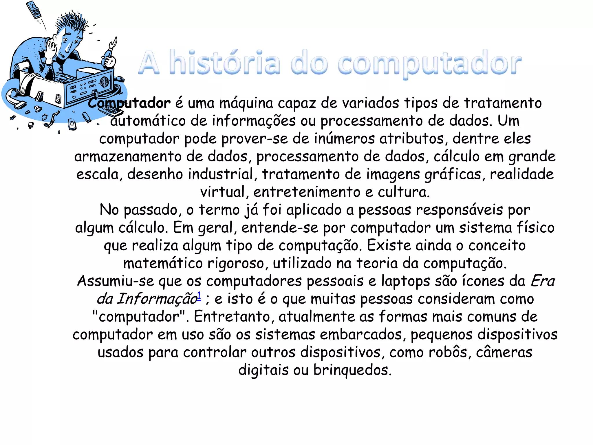 O documento descreve a história dos computadores, desde as primeiras máquinas mecânicas capazes de realizar cálculos até os computadores digitais modernos. Inclui detalhes sobre inventores pioneiros como Charles Babbage, Konrad Zuse e John von Neumann.