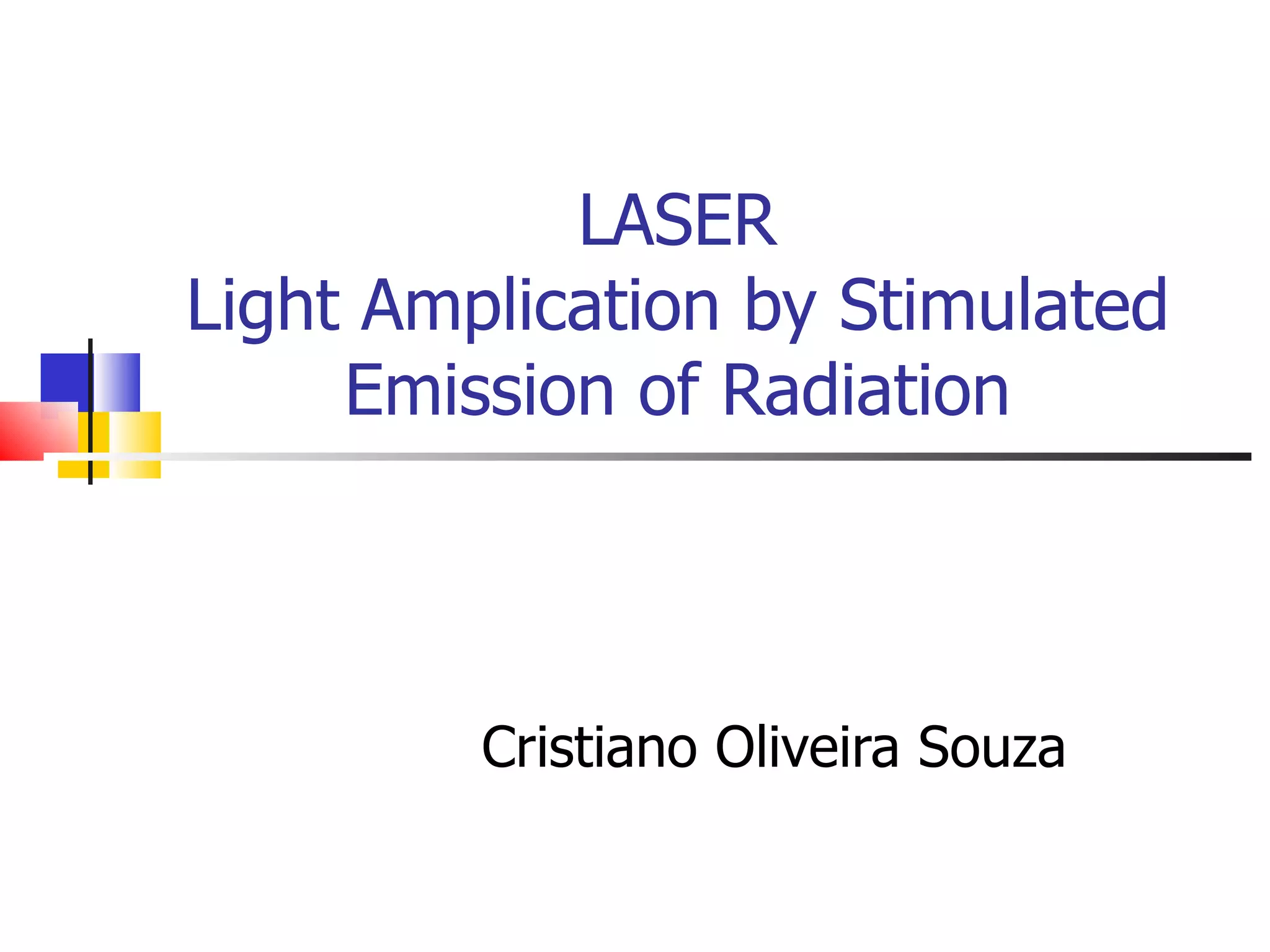 Este documento descreve os tipos, classificação, efeitos e aplicações do laser terapêutico. O laser vermelho é recomendado para feridas superficiais e estruturas musculoesqueléticas mais profundas, com profundidade de penetração de 1-4 mm. A radiação laser estimula a microcirculação, reparo tecidual, analgesia e outros efeitos fisiológicos positivos. A dose deve ser aumentada gradualmente até a resposta desejada entre 1-6 J/cm2, aplicada diariamente ou 3x por semana.