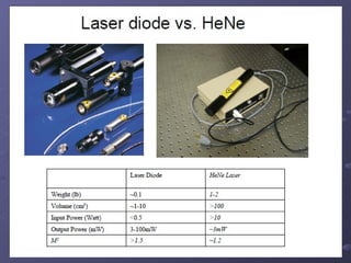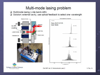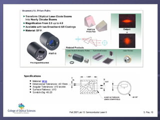 O documento descreve a história e os princípios dos lasers semicondutores, incluindo seu desenvolvimento inicial na década de 1960 e as diferenças em relação aos lasers ópticos tradicionais. Também discute os tipos de lasers semicondutores como VCSEL, lasers de cascata quântica e lasers de ponto quântico, além de suas aplicações em áreas como comunicações por fibra óptica e armazenamento óptico de dados.