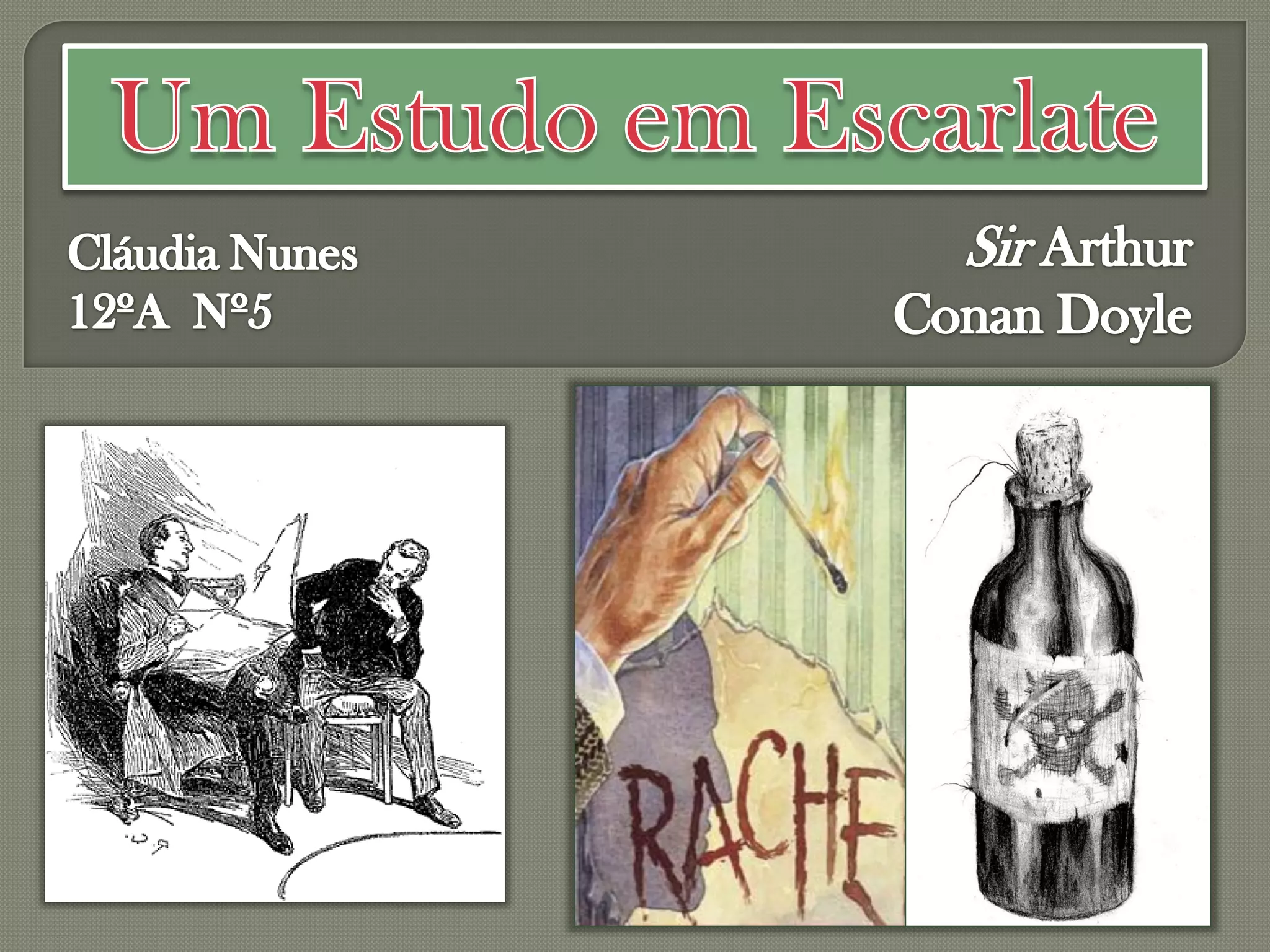 O documento resume a história de Um Estudo em Escarlate de Arthur Conan Doyle, onde Sherlock Holmes resolve o mistério do assassinato de Enoch Drebber. Jefferson Hope assassinou Drebber e Stangerson para vingar a morte de Lucy Ferrier, de quem era apaixonado. Hope confessa os crimes antes de morrer de aneurisma.