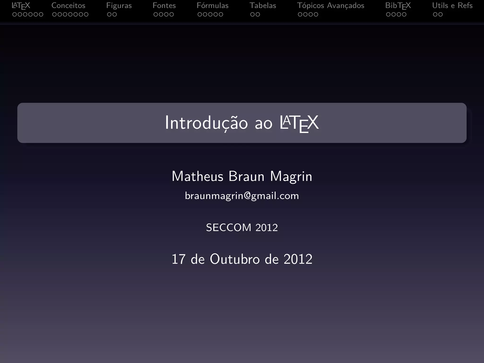 O documento apresenta uma introdução ao LaTeX, discutindo seus principais conceitos, comandos e ambientes. É dividido nas seguintes seções: 1) Conceitos básicos; 2) Figuras; 3) Fontes; 4) Fórmulas matemáticas; 5) Tabelas; 6) Tópicos avançados; 7) BibTeX; 8) Utilidades e referências. O documento fornece exemplos de código LaTeX para ilustrar os tópicos discutidos.