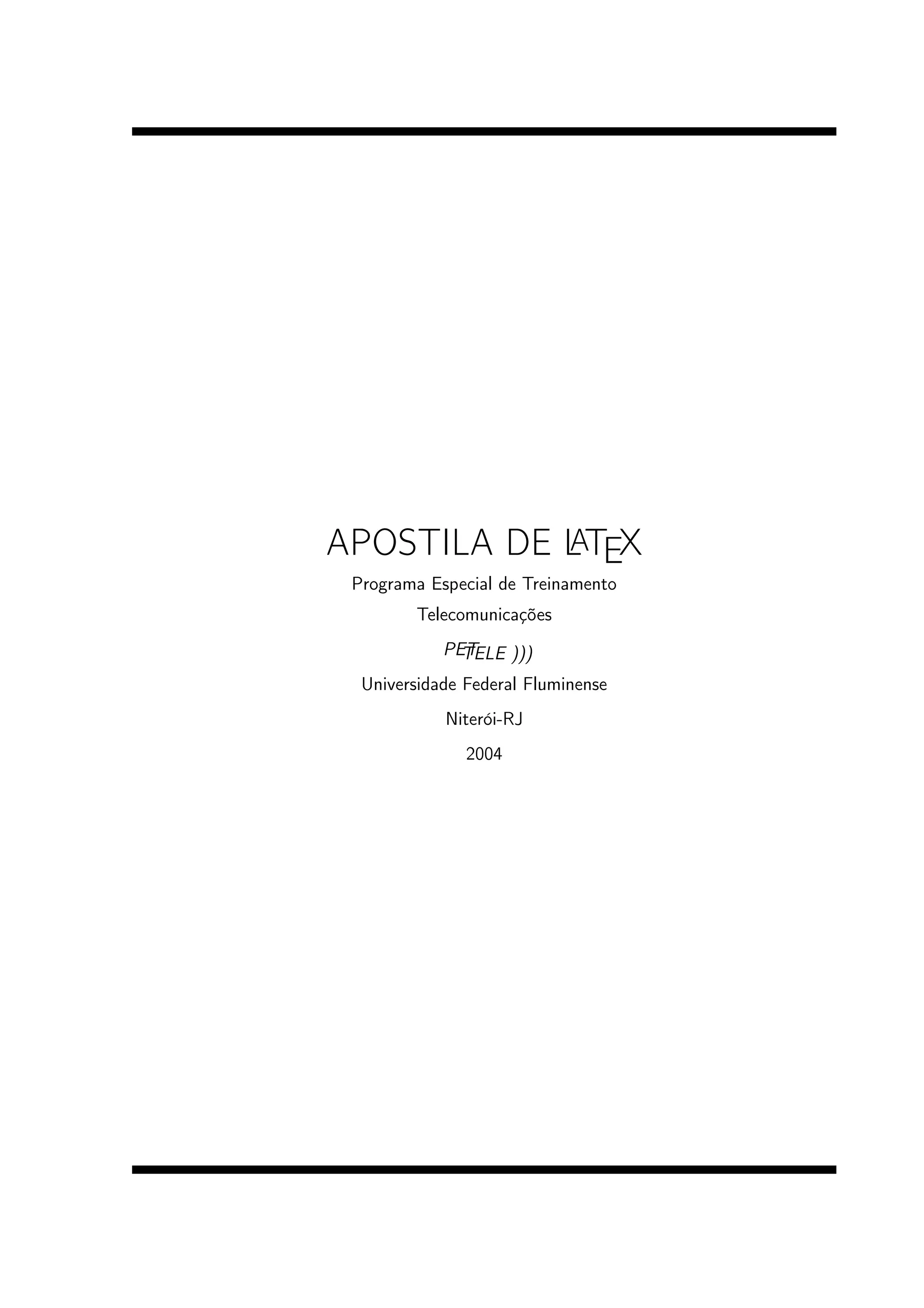 Este documento apresenta um resumo da apostila de LaTeX do Programa Especial de Treinamento de Telecomunicações da Universidade Federal Fluminense. A apostila introduz o sistema LaTeX, explicando sua estrutura, comandos básicos para edição de texto, fórmulas matemáticas, tabelas e movimentação de informações como referências e figuras. O documento também aborda a estrutura visual do documento com recursos como cabeçalhos, rodapés e medidas.