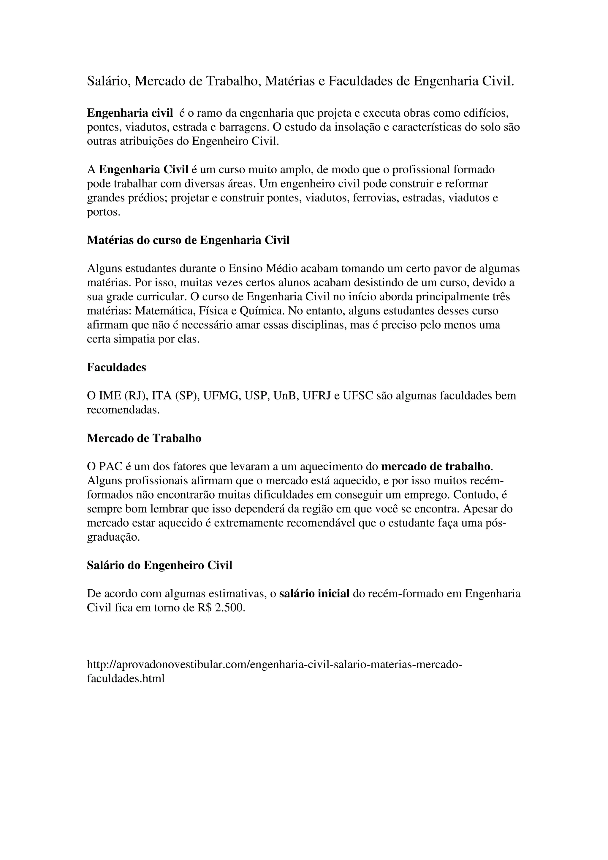 O documento discute a profissão de engenheiro civil, incluindo as matérias do curso, faculdades recomendadas e perspectivas de mercado de trabalho e salário. O curso abrange projetos de construção civil e o profissional pode trabalhar em diversas áreas como construção de prédios, pontes e estradas. As matérias iniciais incluem matemática, física e química. O mercado está aquecido devido ao PAC e o salário inicial é de aproximadamente R$2.500.