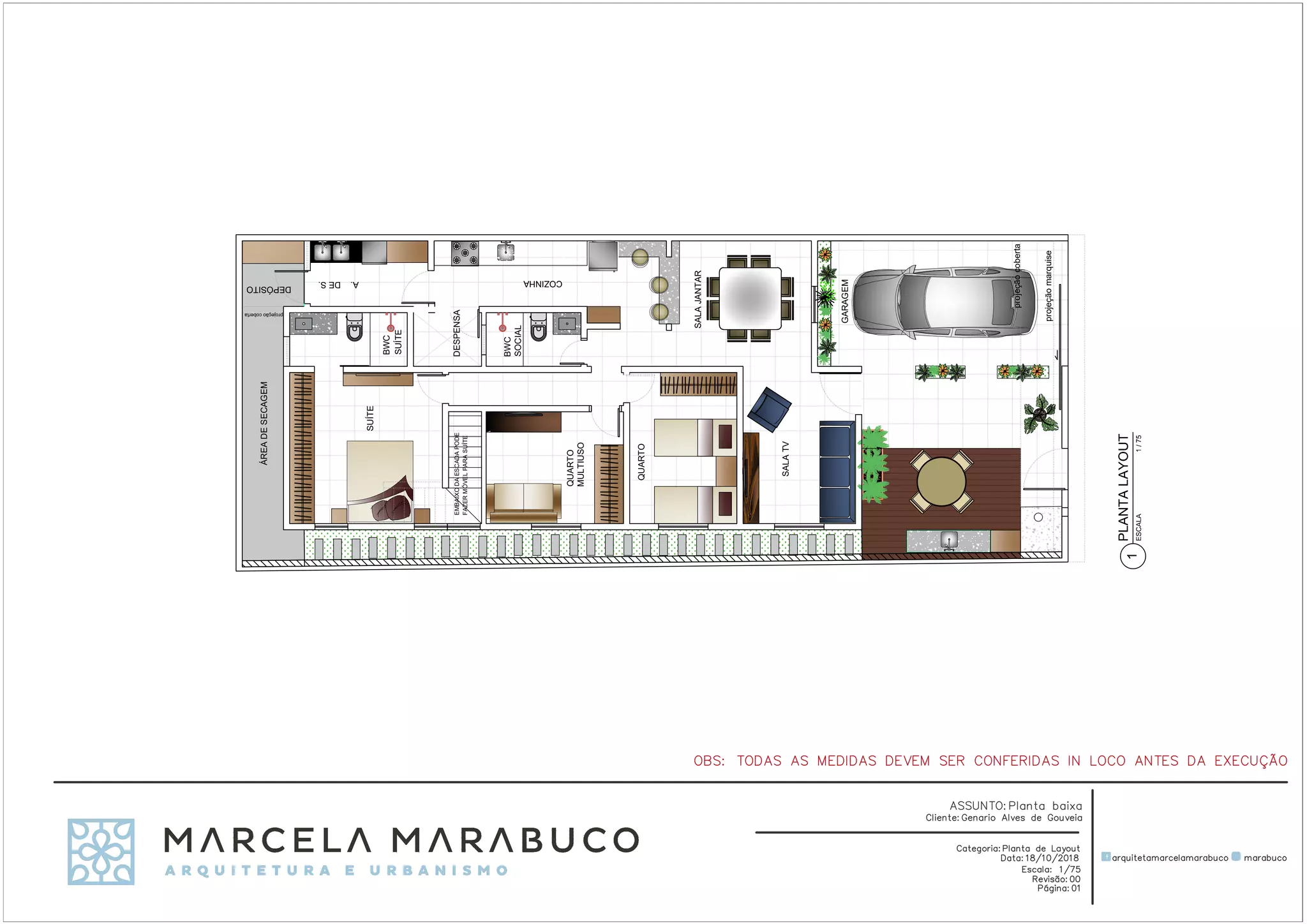 O documento lista as divisões de uma casa, incluindo quartos, banheiros, sala de TV, cozinha e áreas externas como garagem e depósito. Há também sugestões de melhorias como adicionar móveis em uma suíte e uma área de secagem embaixo da escada.