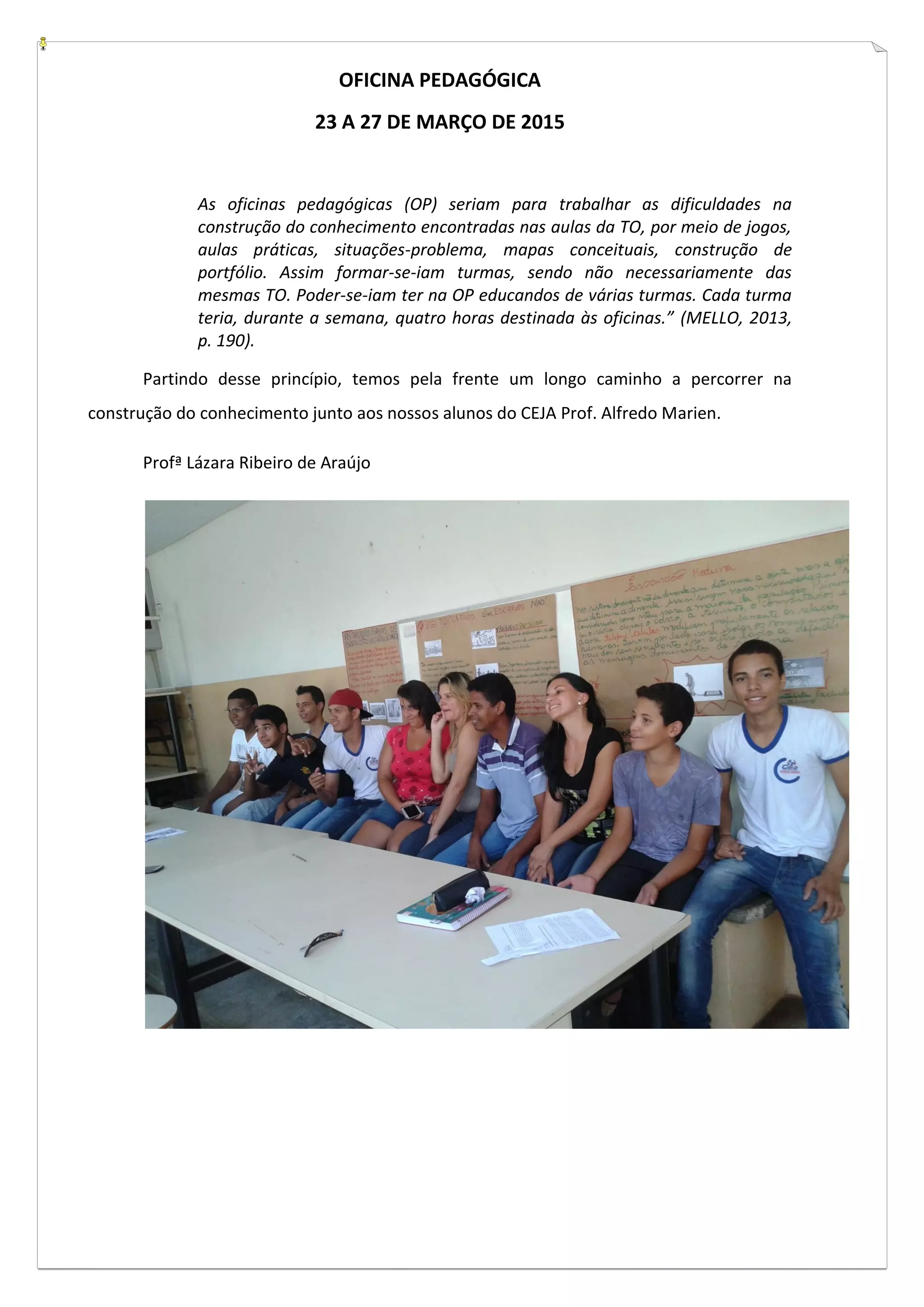 A oficina pedagógica ocorreria de 23 a 27 de março de 2015 para trabalhar dificuldades de aprendizagem por meio de jogos, aulas práticas e situações-problema. As turmas seriam formadas com alunos de diferentes turmas e teriam quatro horas semanais dedicadas às oficinas.