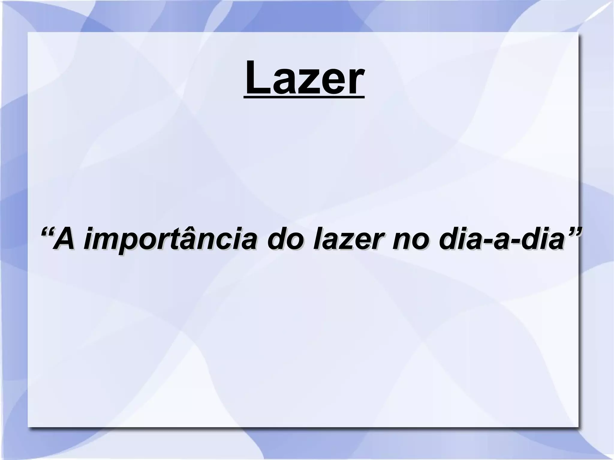 Este documento discute a importância do lazer no dia-a-dia. Ele define lazer como tempo livre e atividades de não trabalho e explica que o lazer é importante cultural e economicamente. Também fornece tarefas e recursos para os alunos pesquisarem sobre lazer e suas diferentes formas.