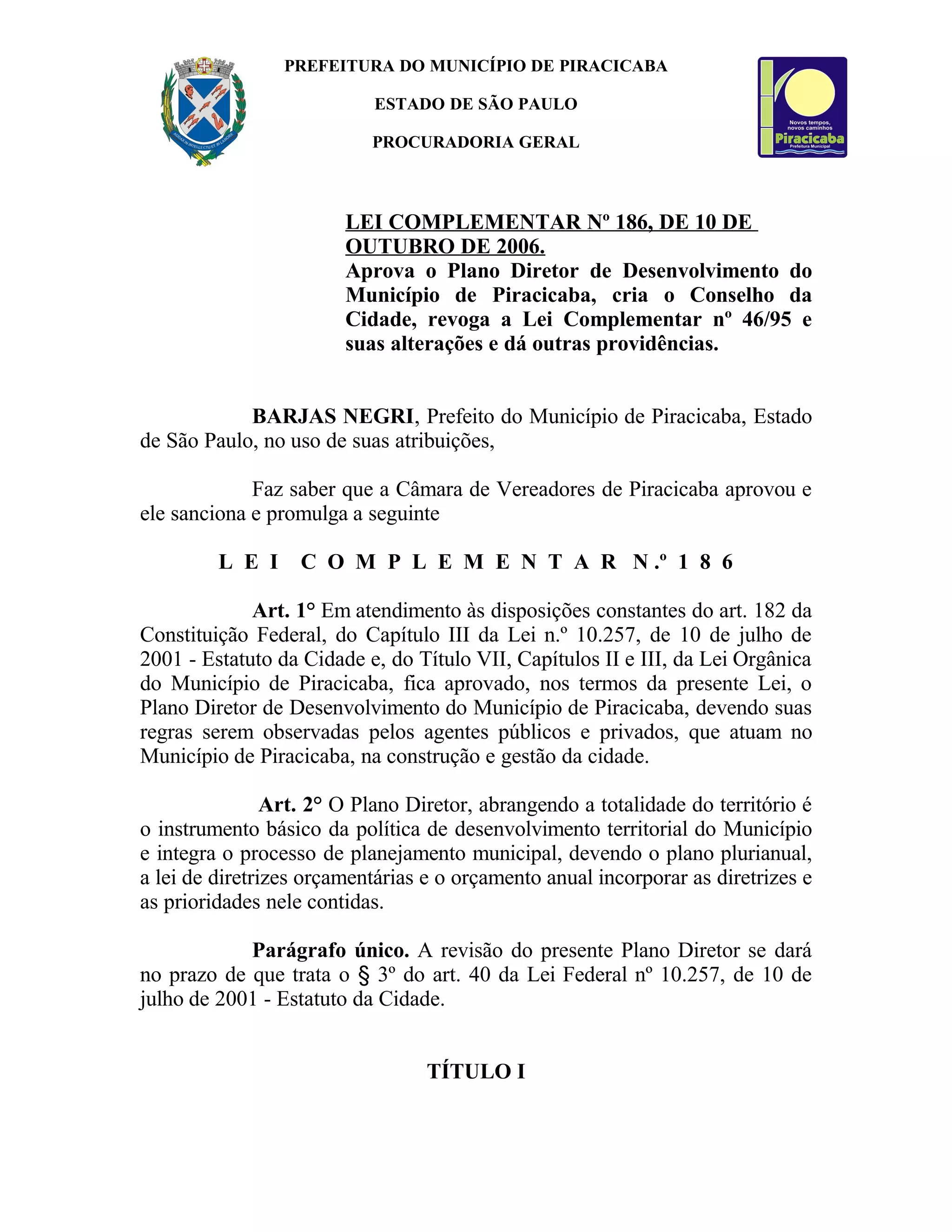 Este documento aprova o Plano Diretor de Desenvolvimento do Município de Piracicaba, cria o Conselho da Cidade e revoga leis anteriores. O Plano Diretor tem como objetivos ordenar o uso do solo, garantir a distribuição justa dos benefícios da urbanização e preservar o patrimônio histórico e ambiental da cidade.