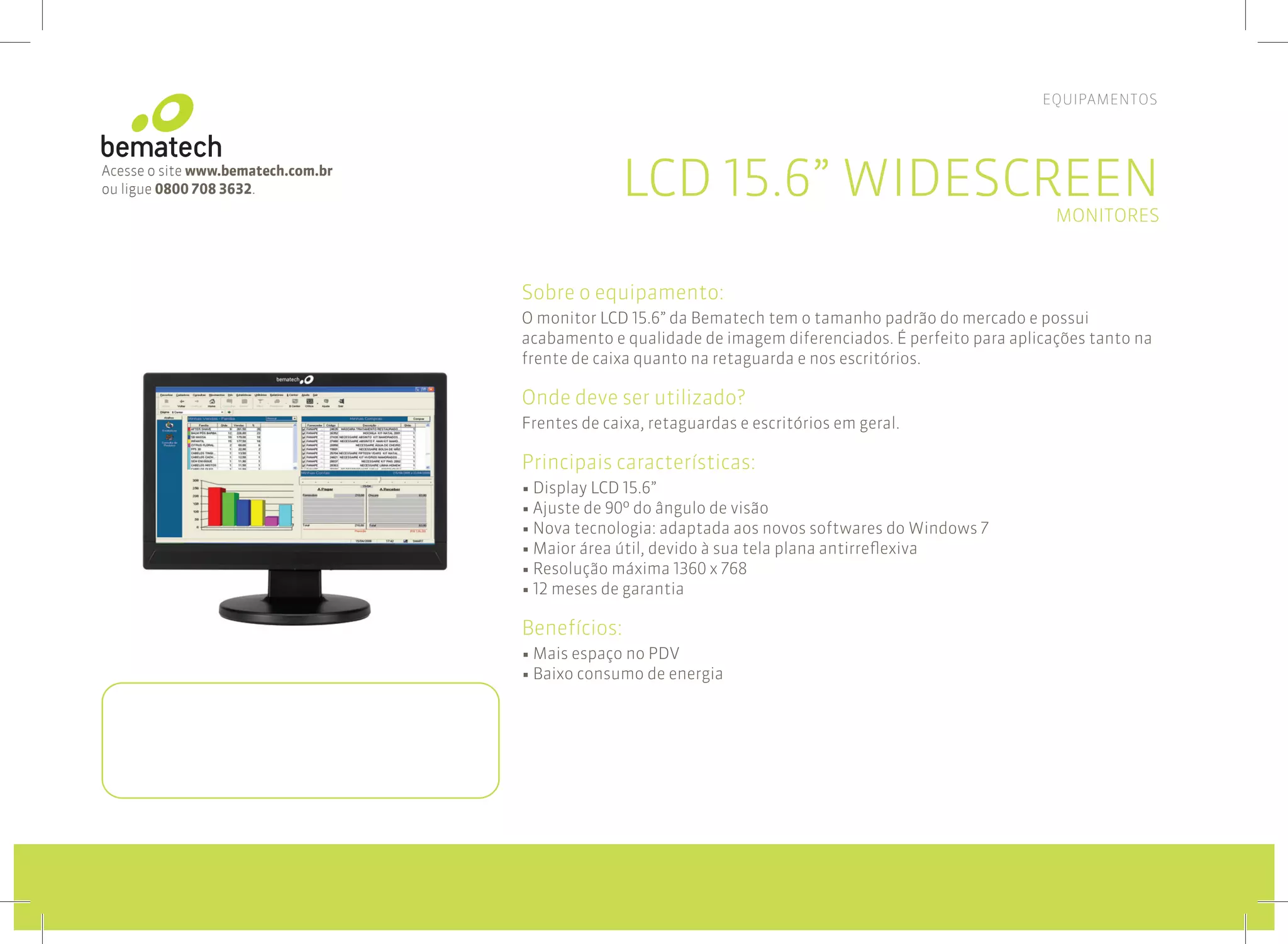 O documento descreve um monitor LCD 15.6 polegadas da Bematech, incluindo seus usos em frente e retaguarda de caixa e escritórios, características como tela plana antirreflexiva e resolução de 1360 x 768, e benefícios como economia de espaço e energia.