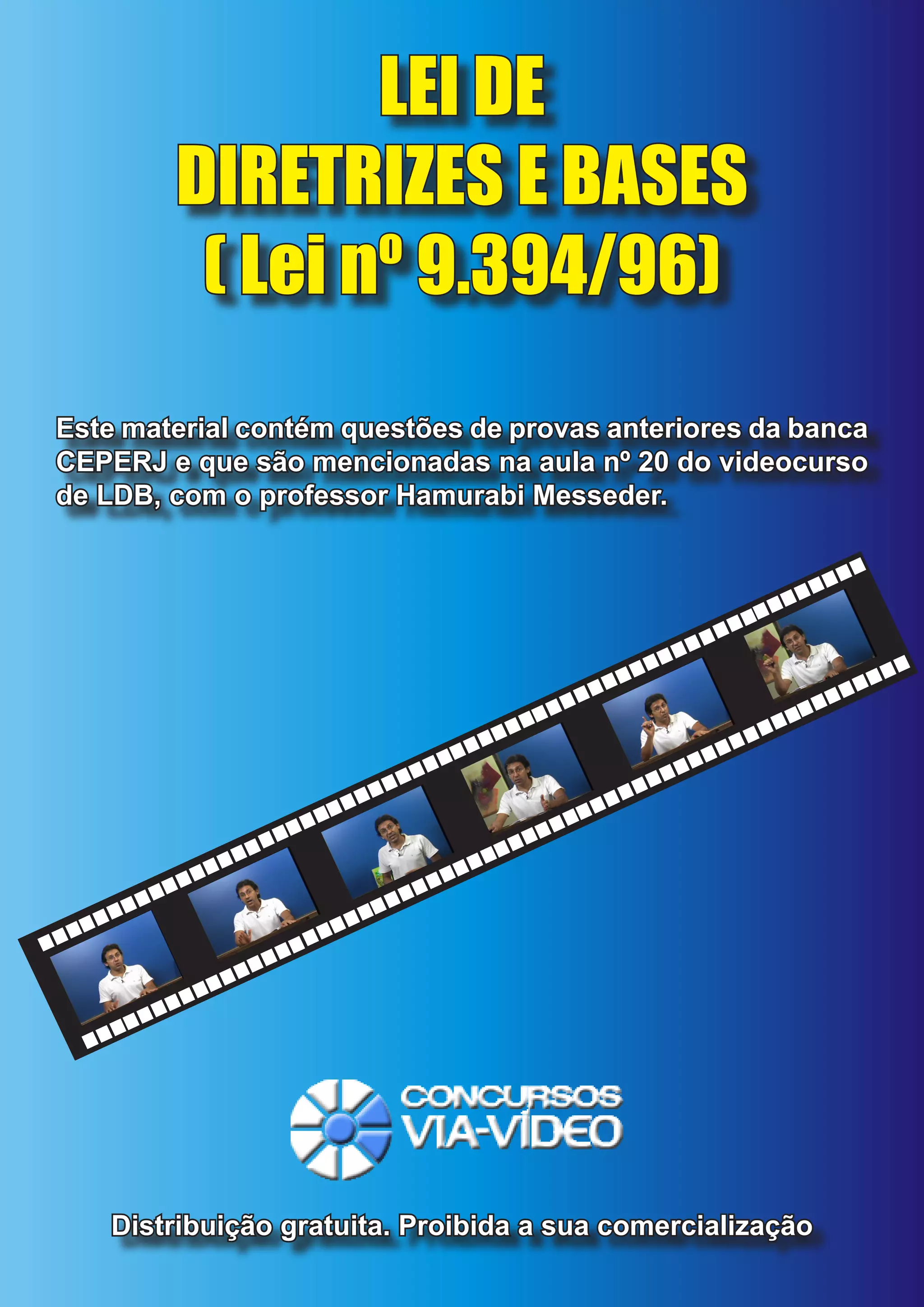 O documento apresenta questões de provas anteriores de concursos públicos relacionadas à Lei de Diretrizes e Bases da Educação Nacional. As questões abordam tópicos como os princípios da educação brasileira, a composição dos sistemas de ensino, as finalidades do ensino médio e a educação de jovens e adultos. Também são apresentadas as respostas corretas para algumas das questões.