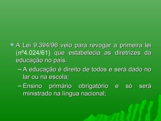 A Constituição Federal de 1988 estabelece os princípios e diretrizes da educação nacional, definindo a educação como direito de todos e dever do Estado. A lei 9.394/96, conhecida como Lei de Diretrizes e Bases da Educação Nacional, revogou a lei anterior e regulamentou o sistema educacional brasileiro de acordo com a Constituição.