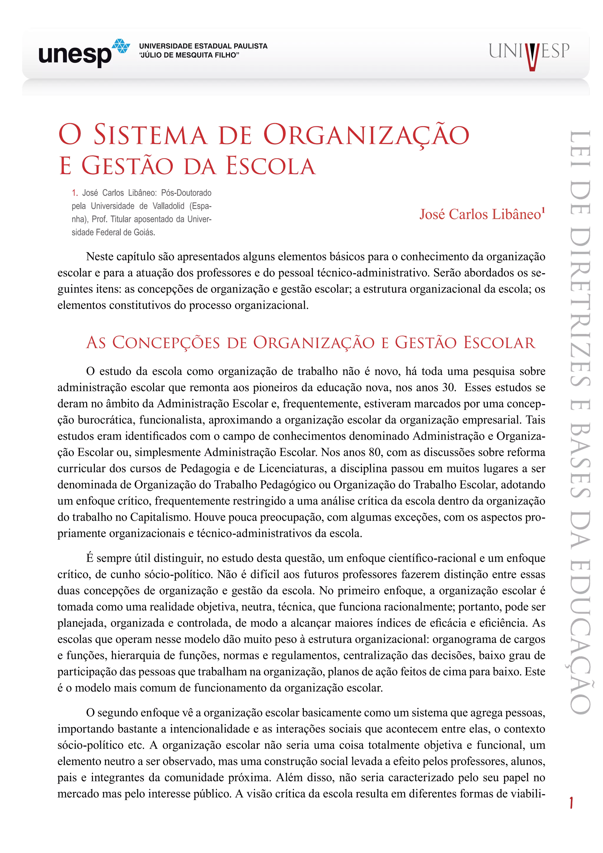 1. O documento discute as concepções de organização e gestão escolar, incluindo modelos técnico-científico, autogestionário e democrático-participativo.
