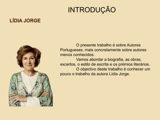 O documento descreve a autora portuguesa Lídia Jorge, incluindo sua biografia, obras principais, estilo de escrita e prêmios literários. Aborda sua vida e carreira, com foco em romances que exploram temas como a condição feminina e mudanças sociais em Portugal após 1974.