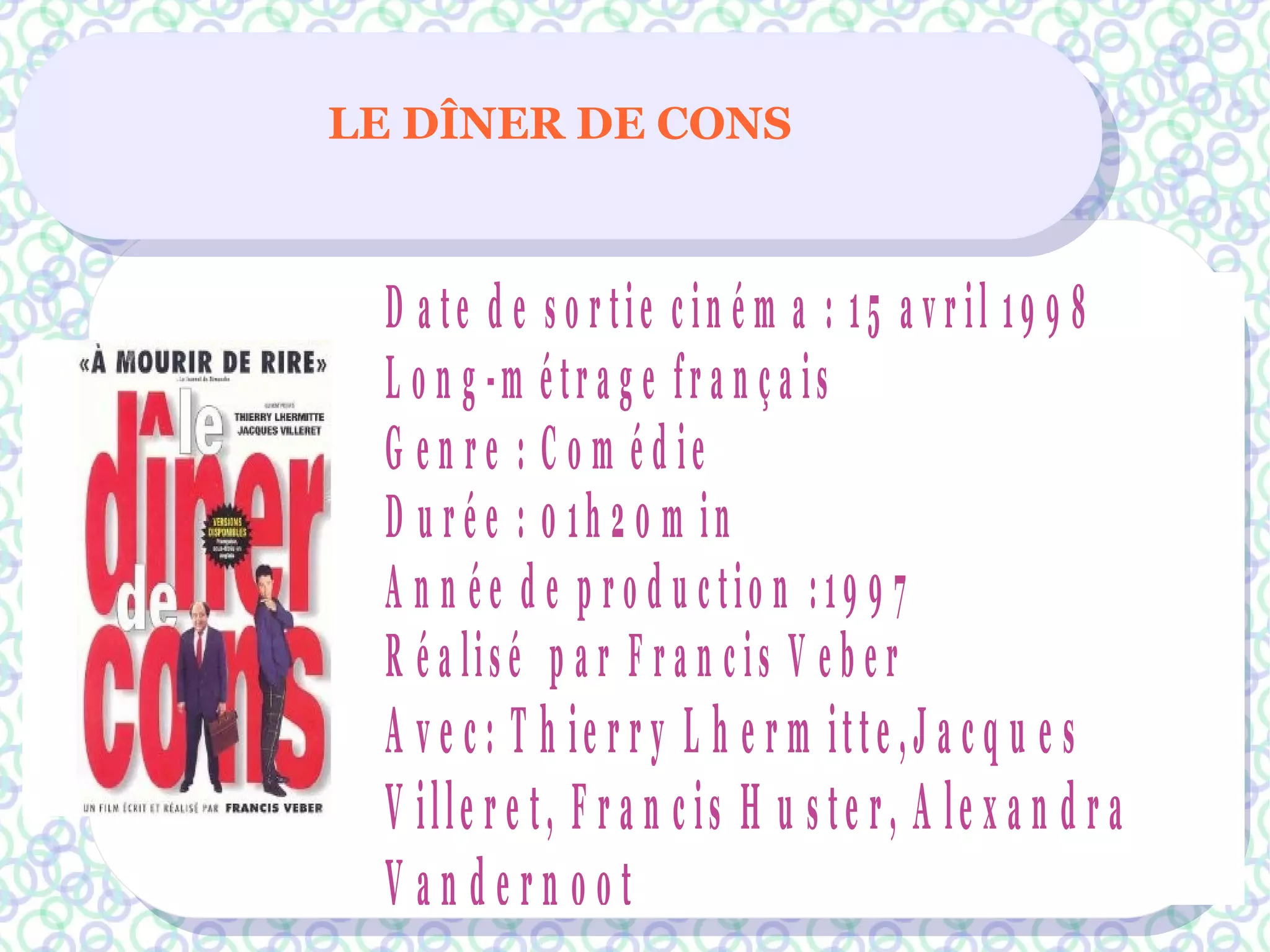 O documento apresenta o filme francês "Le Dîner de Cons", dirigido por Francis Veber em 1998. O filme é uma comédia sobre um grupo de amigos que se reúnem semanalmente para jantar, onde cada um deve trazer um "idiota" convidado. No entanto, o convidado de Pierre não é quem parece ser e acaba provocando uma série de catástrofes durante o jantar.