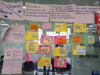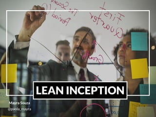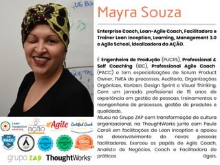 O documento descreve a experiência profissional e especializações de Mayra Souza em facilitação de workshops de Lean Inception. Ela tem 15 anos de experiência em gestão, treinamentos e reengenharia de processos. Trabalhou no Grupo ZAP facilitando transformações culturais e apoiando o desenvolvimento de novas facilitadoras.