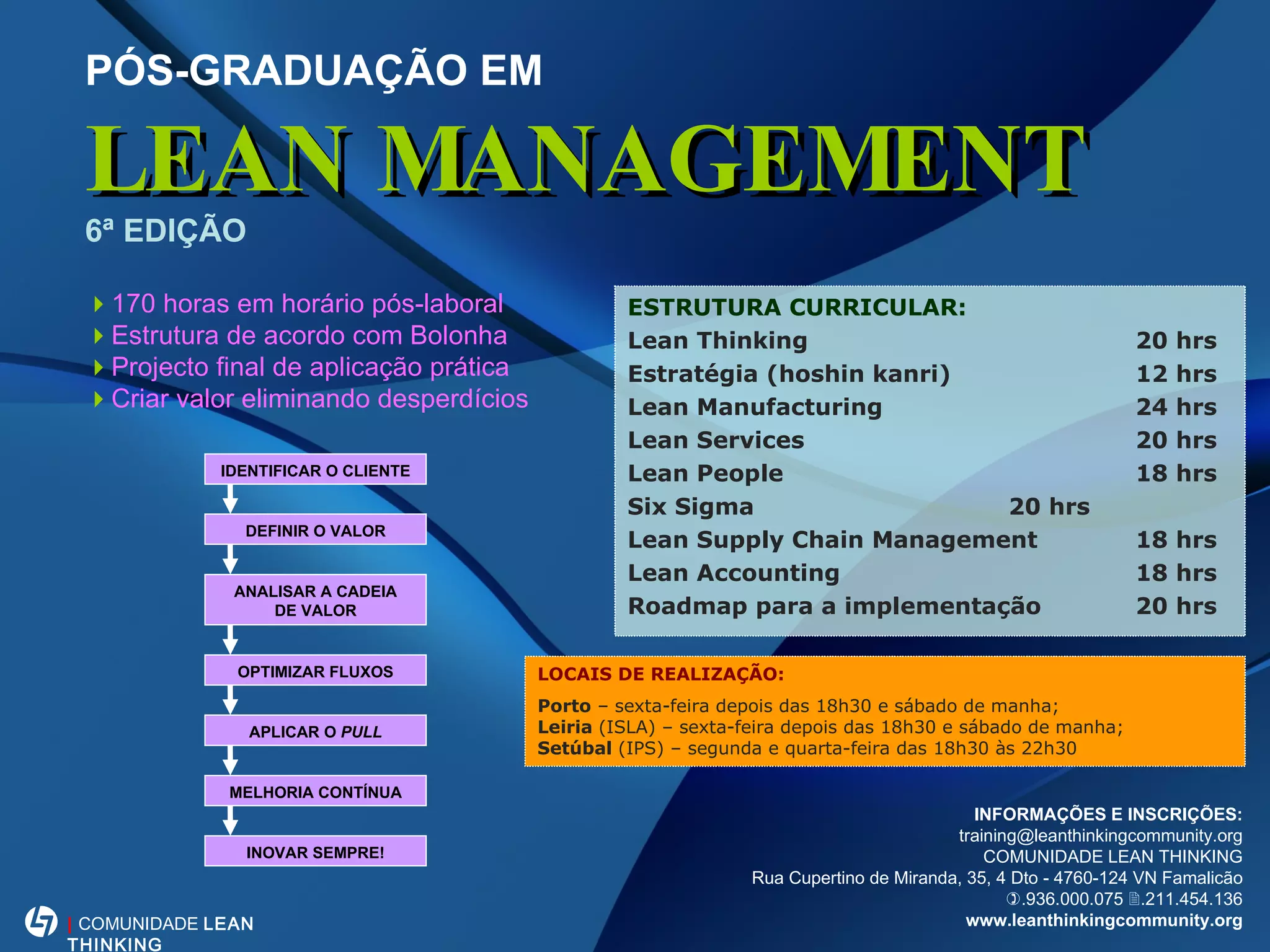 O documento descreve um curso de pós-graduação em Lean Management com 170 horas, abordando tópicos como Lean Thinking, Estratégia, Manufacturing, Serviços, Pessoas, Supply Chain e Contabilidade. O curso será realizado em Porto, Leiria e Setúbal em horários pós-laborais e fins de semana, com projeto final de aplicação prática.