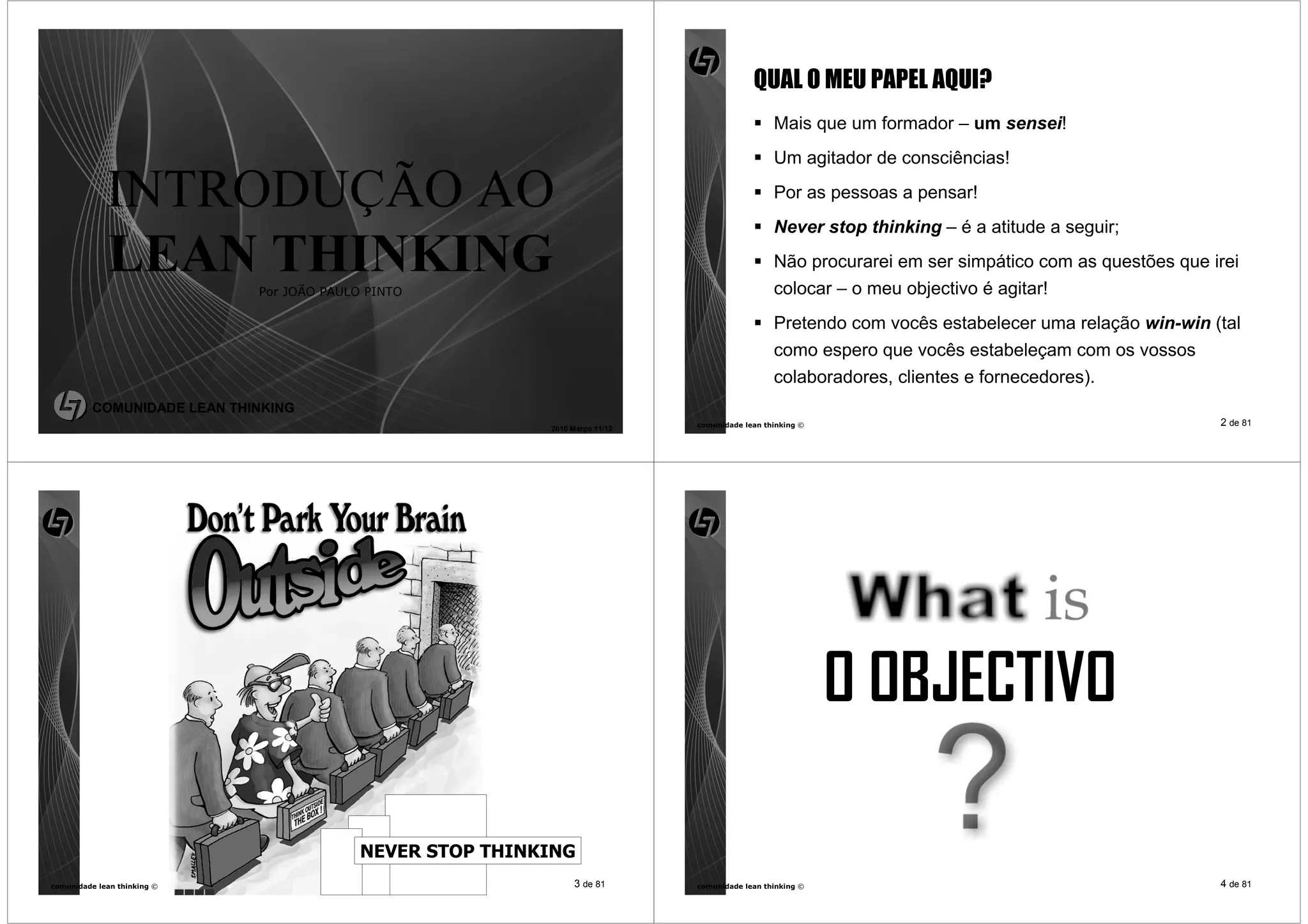 Este documento discute os princípios do Lean Thinking e como eles podem ser aplicados para melhorar a eficiência e satisfação do cliente. O autor argumenta que as organizações precisam se concentrar em eliminar desperdícios, melhorar continuamente os processos, e envolver as pessoas. O objetivo final é fornecer valor máximo para o cliente com o menor custo e tempo possível.
