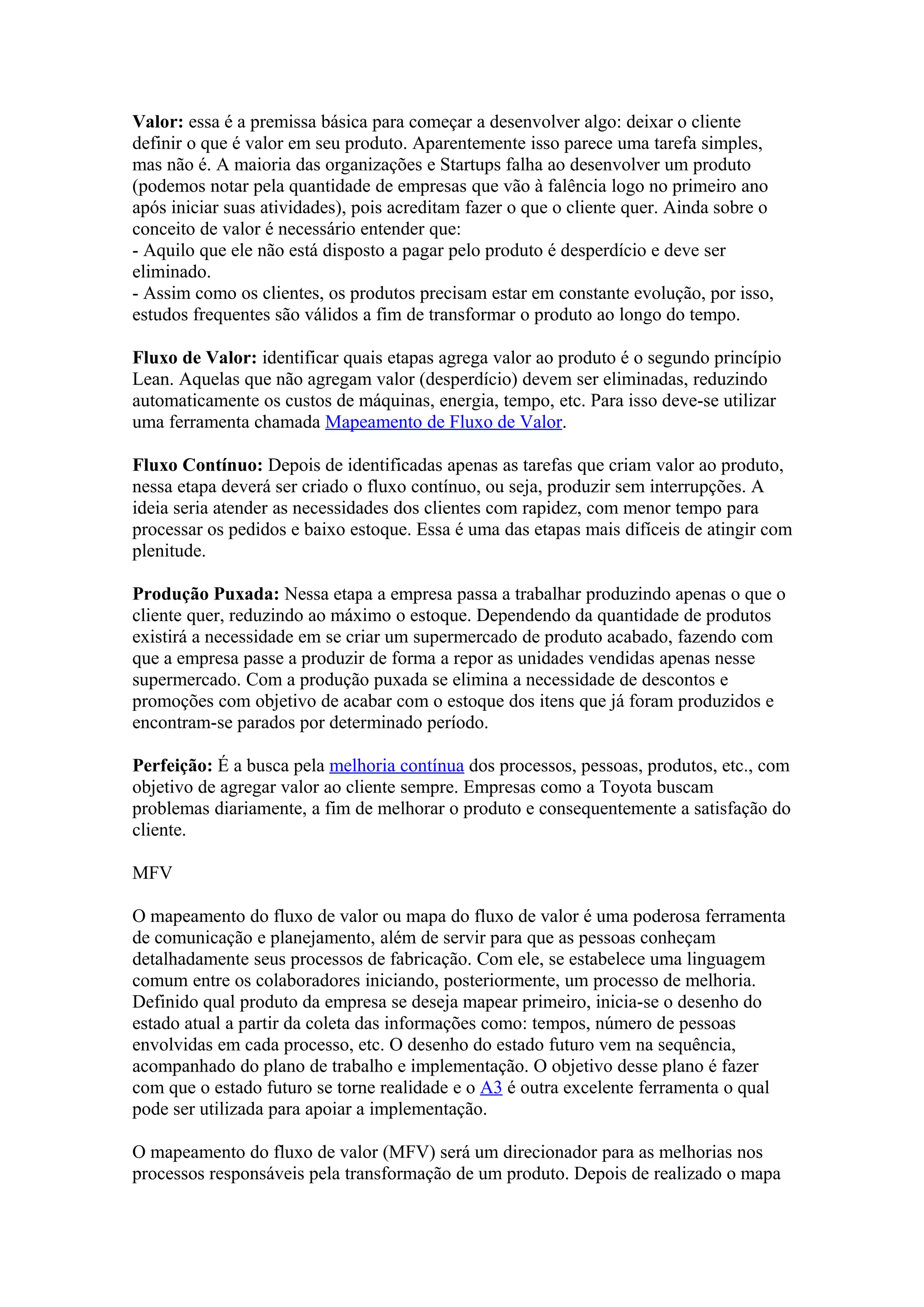 1) O documento discute princípios do sistema de produção Lean, como valor para o cliente, mapeamento do fluxo de valor, fluxo contínuo e produção puxada.