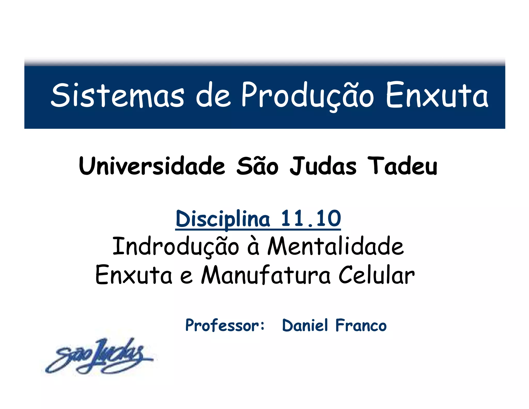 Este documento apresenta o programa de um curso sobre Sistemas de Produção Enxuta ministrado na Universidade São Judas Tadeu. O curso aborda os principais tópicos da mentalidade enxuta como mapeamento do fluxo de valor, KAIZEN, TQM, TPM, manufatura celular, sistema puxado de produção e ferramentas enxutas como SMED, takt time e kanban. O curso é composto por 7 módulos e avalia os alunos por meio de trabalhos em grupo e provas individuais.