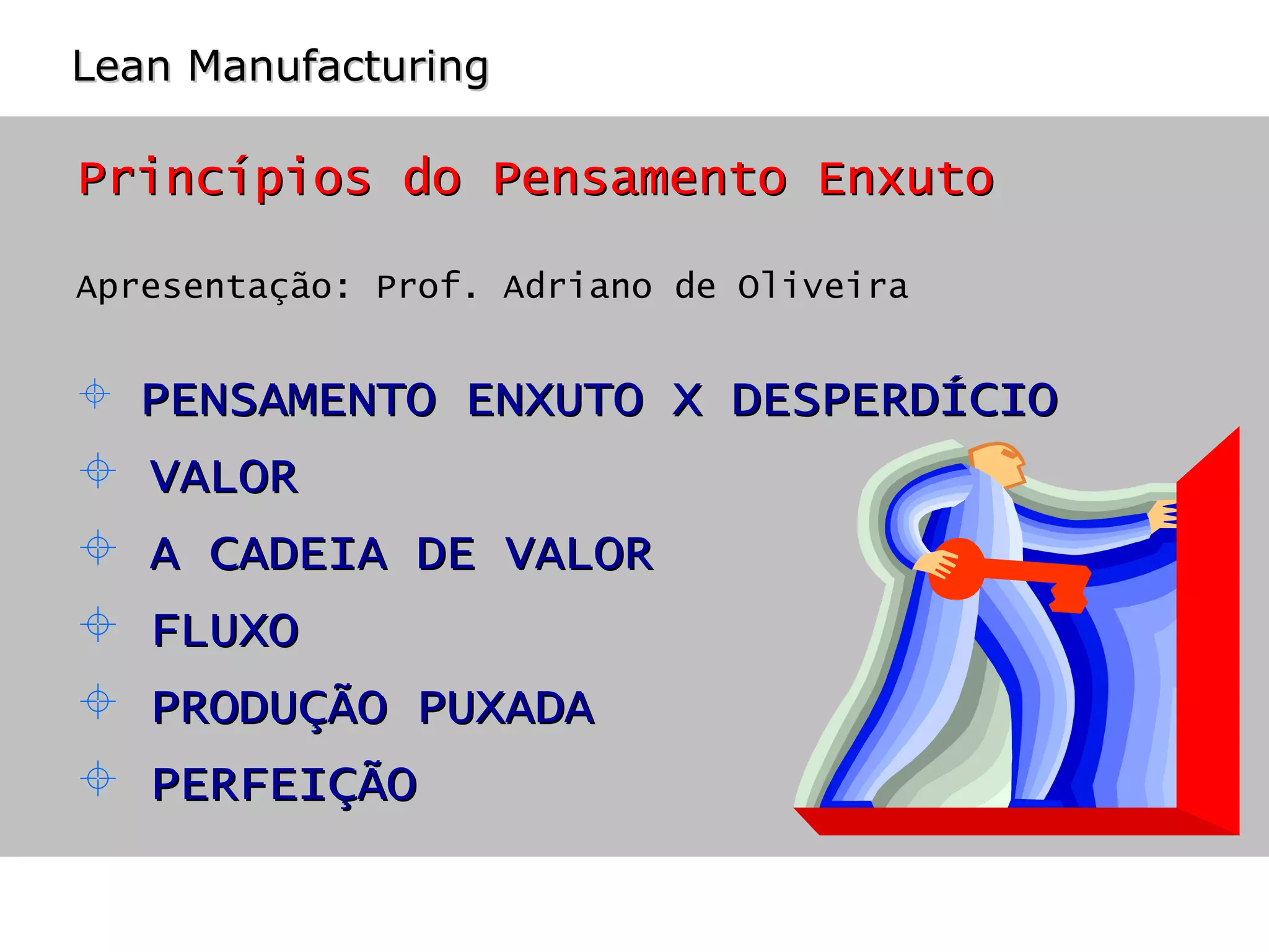 O documento discute os princípios do pensamento enxuto, incluindo a eliminação de desperdícios, a criação de valor para o cliente, o mapeamento da cadeia de valor para identificar atividades que não criam valor, a produção puxada pelo pedido do cliente e a perfeição contínua por meio da transparência.