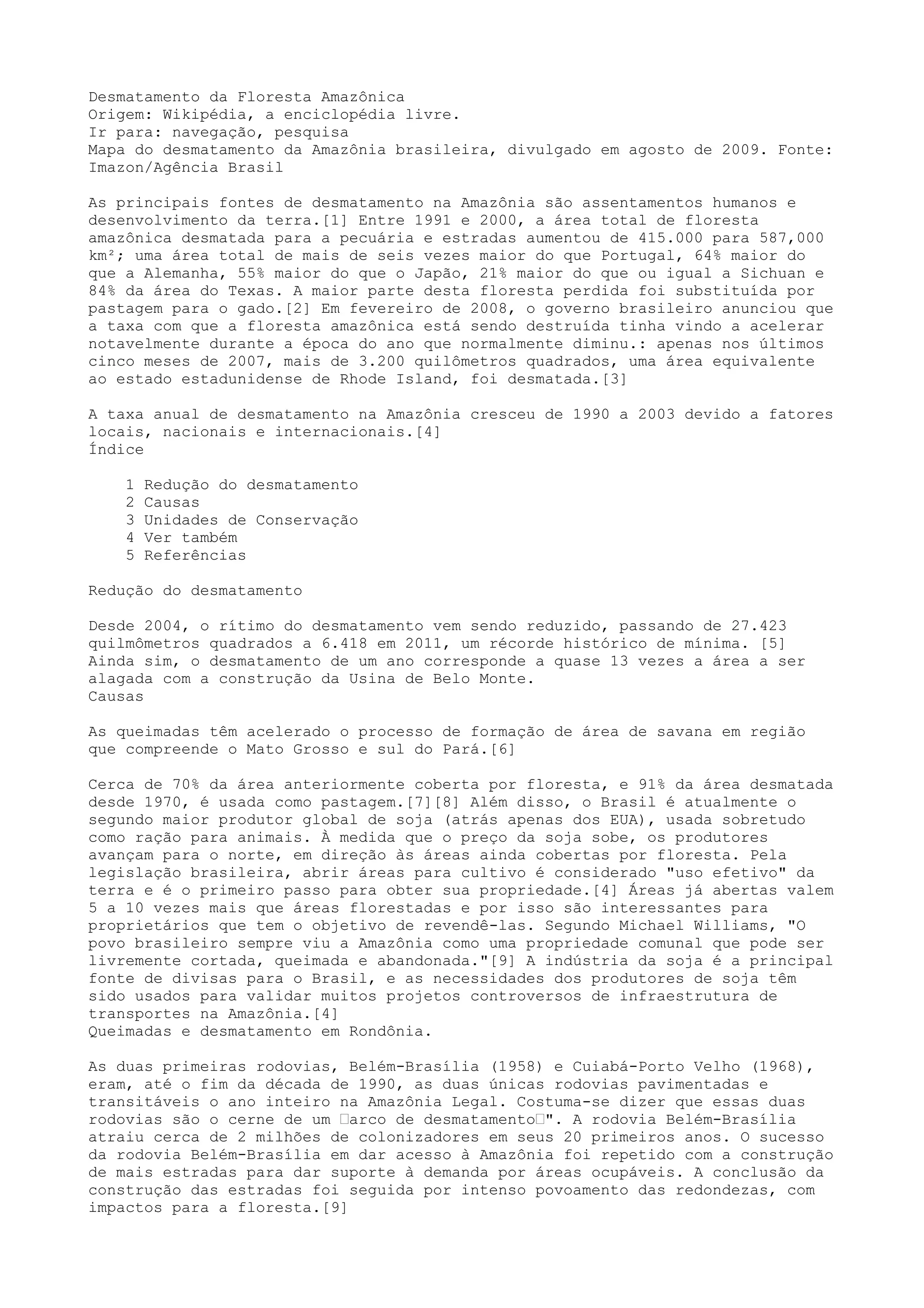 O documento descreve as principais causas do desmatamento da Floresta Amazônica, incluindo assentamentos humanos, expansão da pecuária e agricultura, principalmente soja. A taxa de desmatamento cresceu de 1990 a 2003, mas vem sendo reduzida desde 2004, embora ainda seja alta. Estradas e flutuações nos preços de commodities influenciam as taxas de desmatamento.