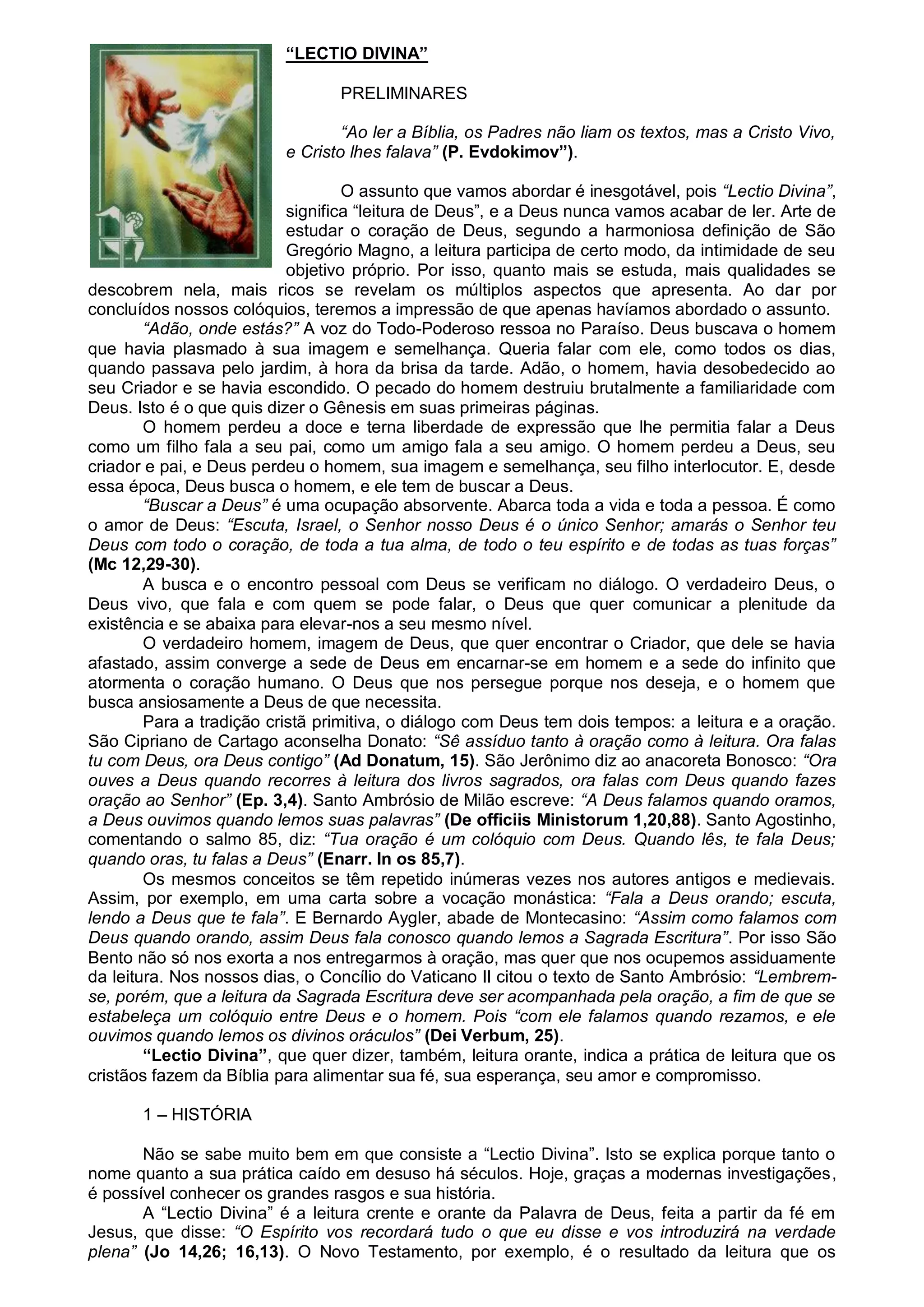 1) A Lectio Divina é uma prática de leitura orante da Bíblia que remonta aos primeiros cristãos e foi desenvolvida pelos Padres da Igreja como Orígenes e São Gregório Magno.