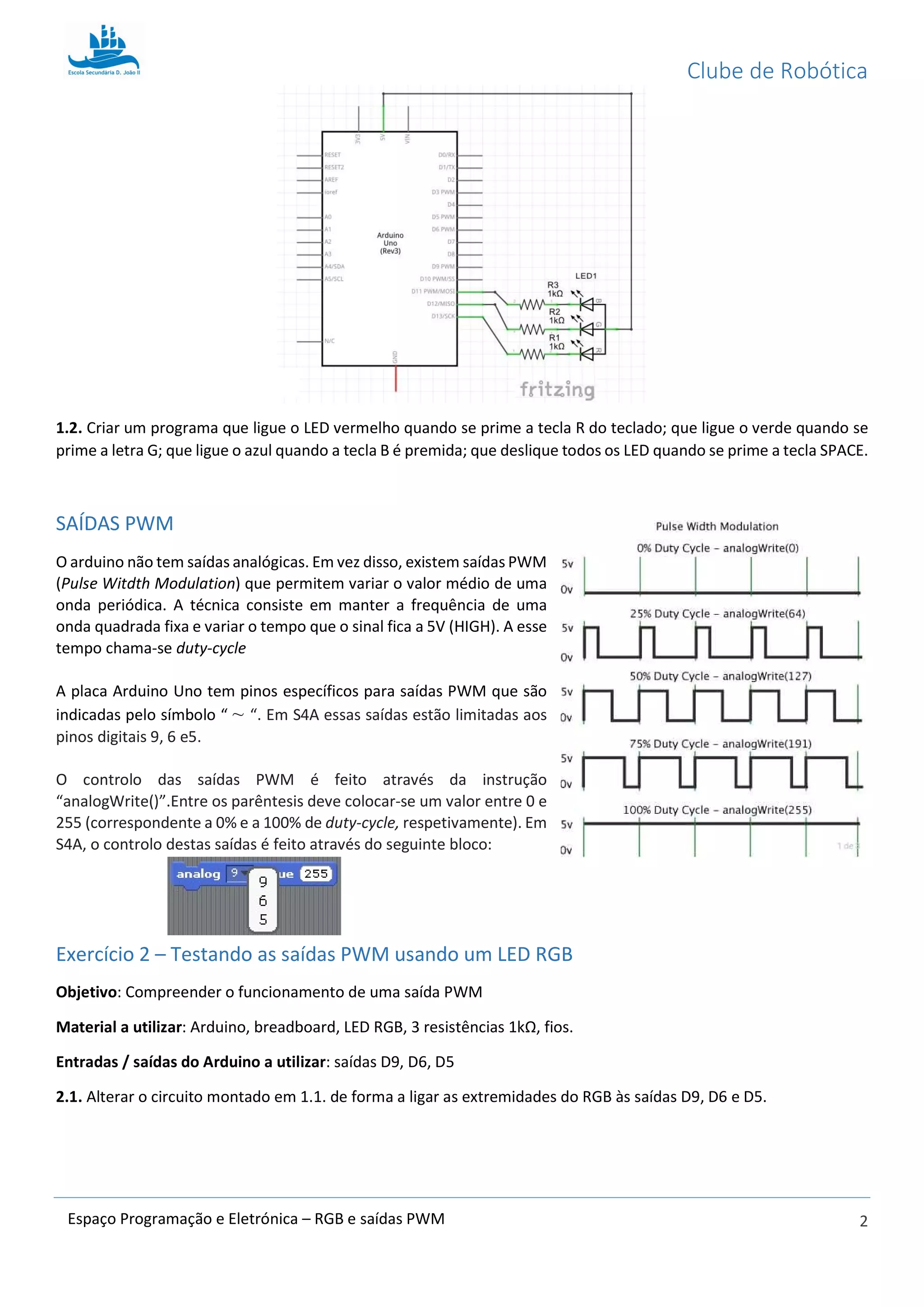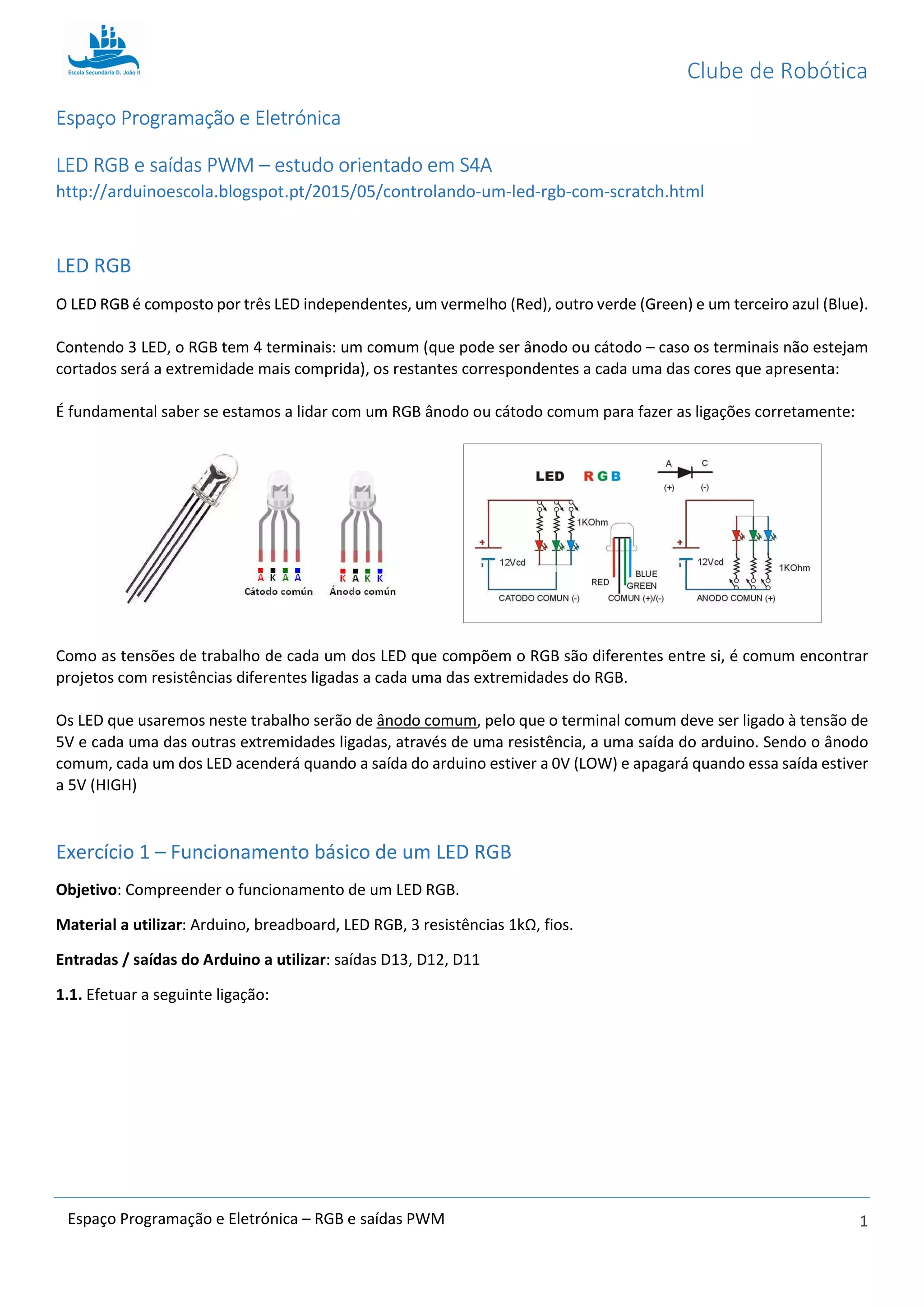 O documento descreve exercícios para controlar um LED RGB usando saídas digitais e PWM do Arduino. Os exercícios ensinam como ligar cada cor do LED RGB individualmente e variar a intensidade usando saídas PWM controladas por entrada analógica ou teclado. O último exercício propõe adicionar um interruptor para selecionar qual cor é controlada.