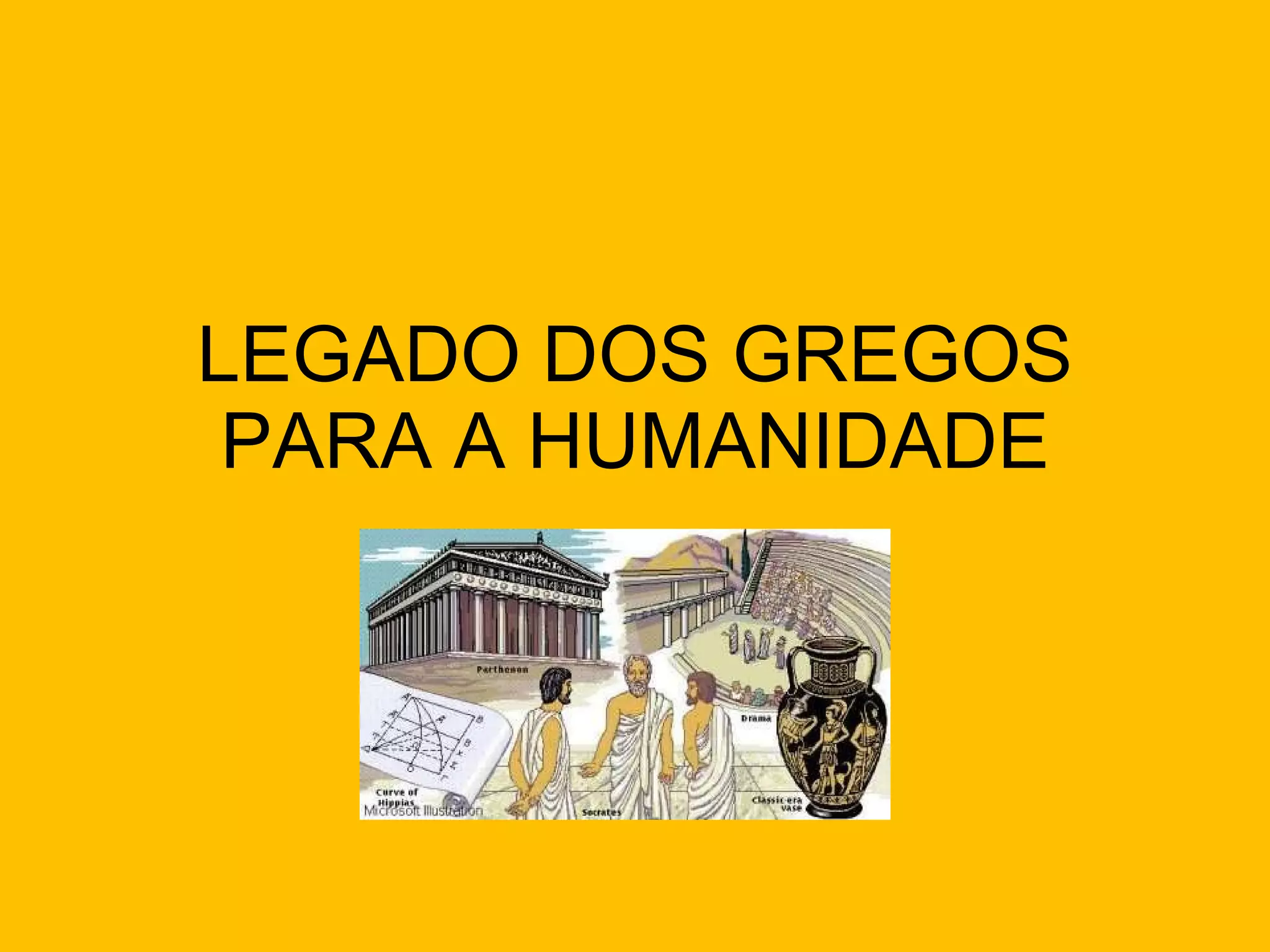A civilização grega influenciou o mundo ocidental de maneiras fundamentais, incluindo: divulgar o alfabeto e a moeda, estabelecer a democracia em Atenas, originar o teatro através do culto de Dionísio, e desenvolver a filosofia, história e oratória. Os gregos legaram conhecimentos nas artes, ciências, esportes e estabeleceram ideias fundamentais sobre o homem.