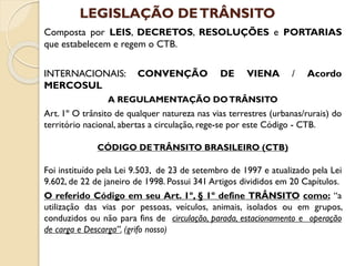 1) O documento descreve a legislação e regulamentação do trânsito no Brasil, incluindo o Código de Trânsito Brasileiro (CTB) e o Sistema Nacional de Trânsito.