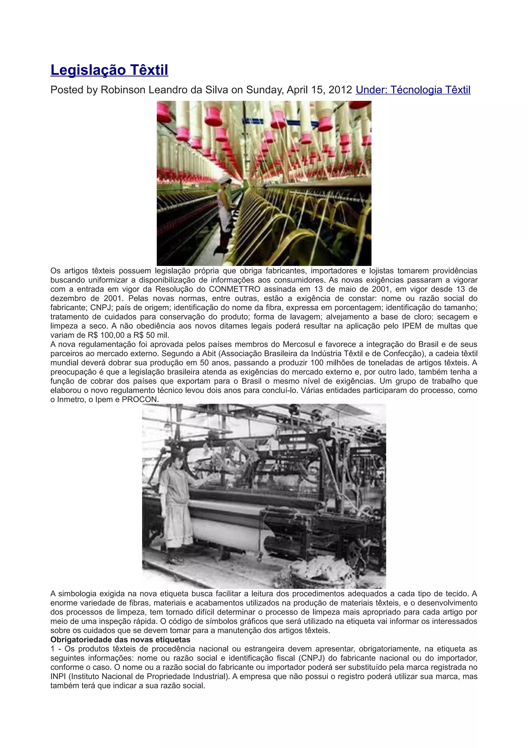 O documento discute a legislação brasileira sobre etiquetagem de produtos têxteis, exigindo informações como composição, fabricante, país de origem e cuidados de conservação. A nova regulamentação busca uniformizar as informações para os consumidores e foi aprovada pelos países do Mercosul.