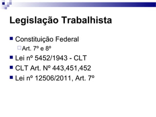 O documento aborda a legislação trabalhista brasileira, incluindo a Constituição Federal e a Consolidação das Leis do Trabalho (CLT), e detalha aspectos como contratos de trabalho, jornada, férias, 13º salário, remuneração e benefícios como FGTS e seguro-desemprego. Destaca que contratos podem ser por prazo determinado ou indeterminado, os direitos dos trabalhadores, e as obrigações dos empregadores em relação a remuneração e adicionais. Além disso, menciona as penalidades por informações falsas e irregularidades no uso de benefícios como vale-transporte.