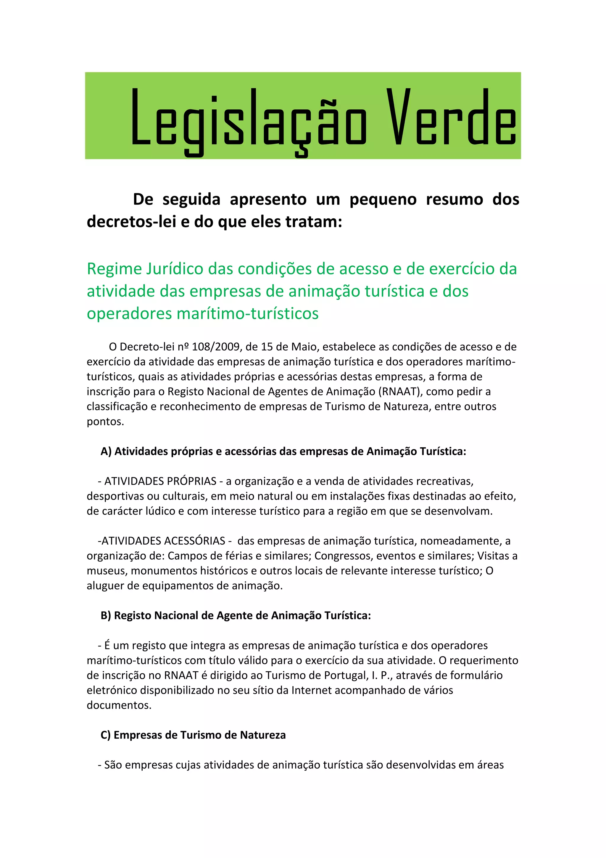 O documento resume dois decretos-lei sobre atividades de animação turística e ambiental. O primeiro decreto define as atividades próprias e acessórias de empresas de animação turística e o registo nacional destas empresas. O segundo decreto regulamenta a animação ambiental em áreas protegidas e o processo de licenciamento destas atividades.