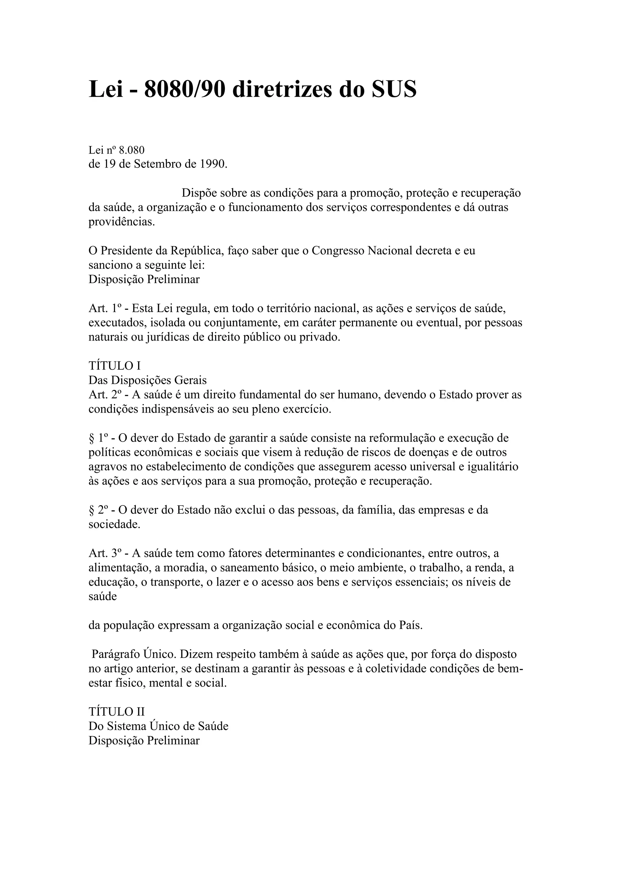 Este documento descreve a Lei 8080/90 que estabelece as diretrizes e princípios do Sistema Único de Saúde brasileiro (SUS). O SUS é definido como o conjunto de ações e serviços de saúde prestados por órgãos públicos federais, estaduais e municipais. Os objetivos do SUS incluem promover a saúde da população e garantir o acesso universal e igualitário aos serviços de saúde.