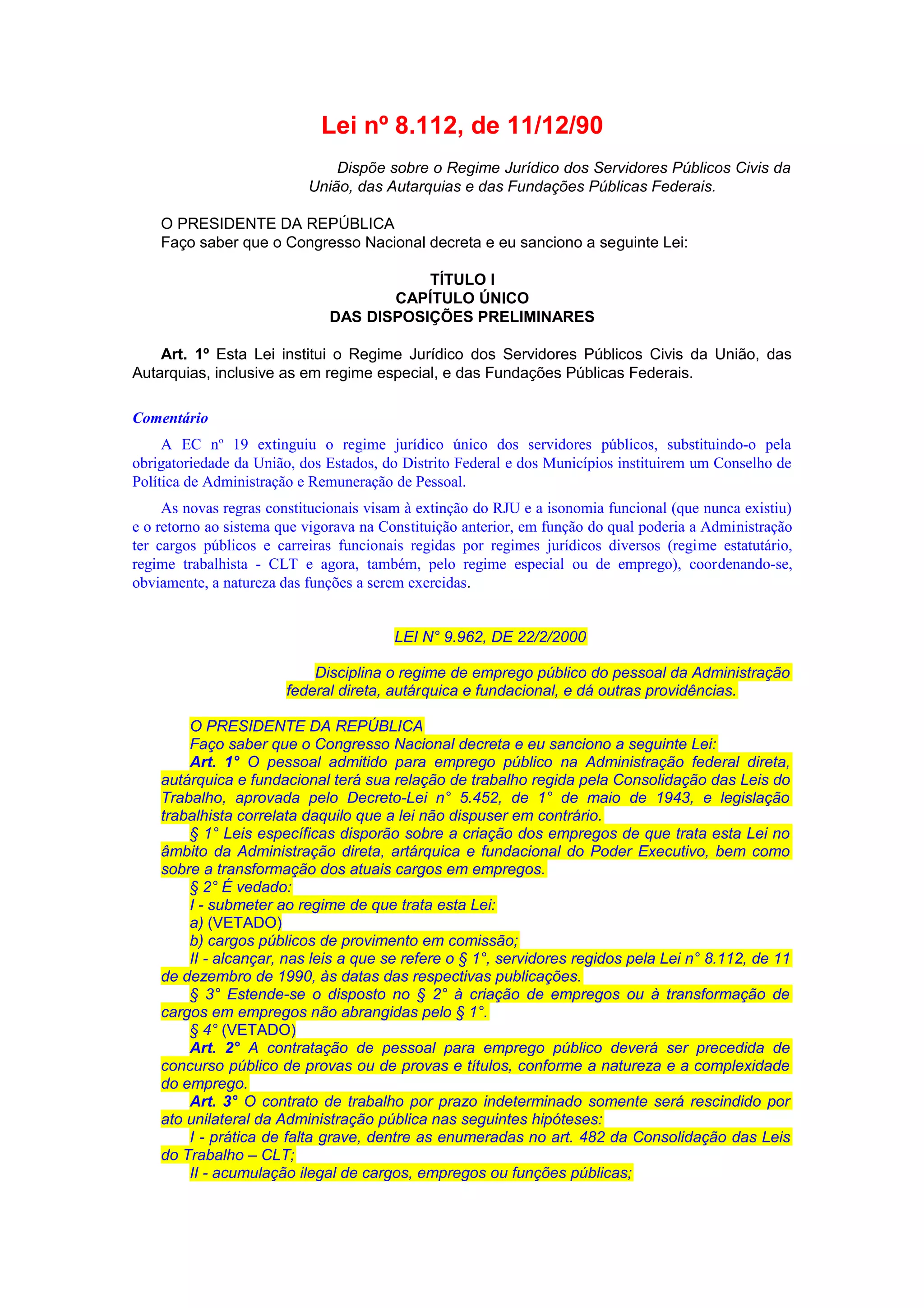 - A Lei no 8.112/1990 estabelece o Regime Jurídico dos Servidores Públicos Civis da União, Autarquias e Fundações Públicas Federais, definindo regras sobre provimento, vacância, remoção, redistribuição e substituição de cargos.