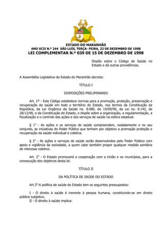 Este documento apresenta o Código de Saúde do estado do Maranhão, que estabelece normas para a promoção, proteção e recuperação da saúde no estado. O código define as competências do estado e dos municípios no Sistema Único de Saúde, incluindo a organização do sistema, a participação de prestadores privados e da comunidade na gestão da saúde.