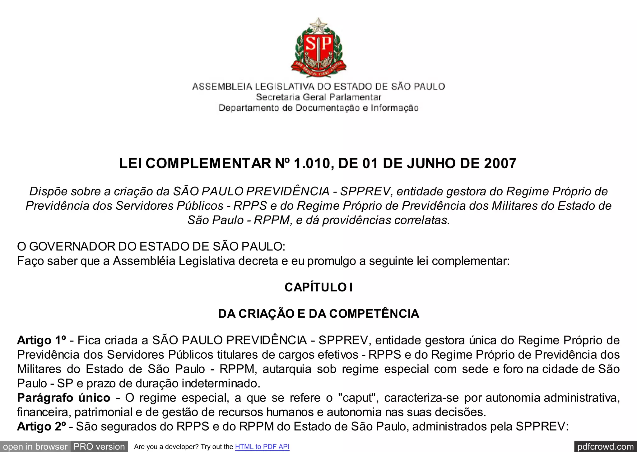 Esta lei complementar cria a São Paulo Previdência (SPPREV), entidade responsável pela gestão dos regimes de previdência dos servidores públicos e militares do estado de São Paulo. A lei define a estrutura organizacional e os órgãos de administração da SPPREV, como o Conselho de Administração e a Diretoria Executiva. Também estabelece as competências e finalidades da SPPREV no que se refere à administração dos benefícios e recursos dos regimes de previdência.