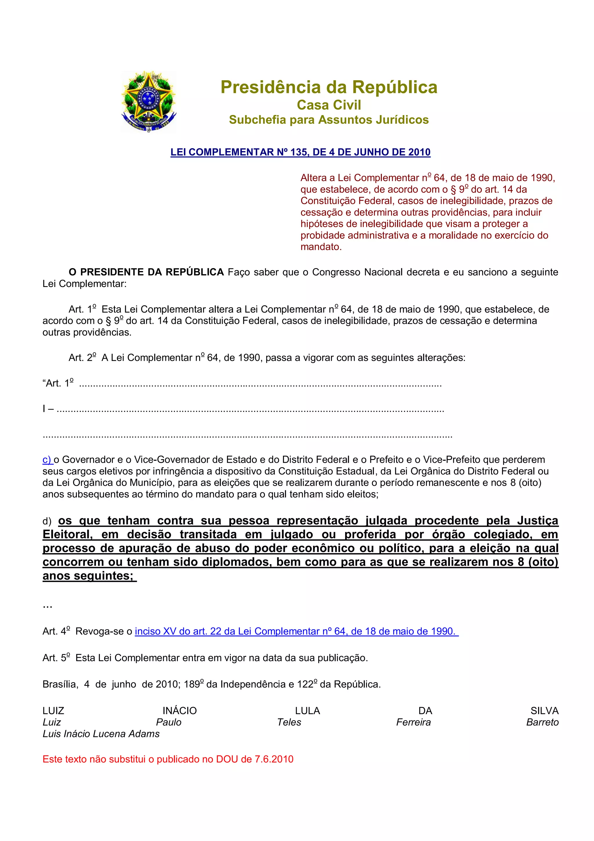 Este documento é uma lei complementar que altera a Lei Complementar no 64 de 1990 para incluir novas hipóteses de inelegibilidade. Ela estabelece a inelegibilidade de governadores, vice-governadores, prefeitos e vice-prefeitos que perderem seus cargos por infringência constitucional, e de candidatos contra quem houver representação julgada procedente por abuso de poder econômico ou político, por 8 anos após o término do mandato. A lei complementar entrou em vigor na data de sua publicação.