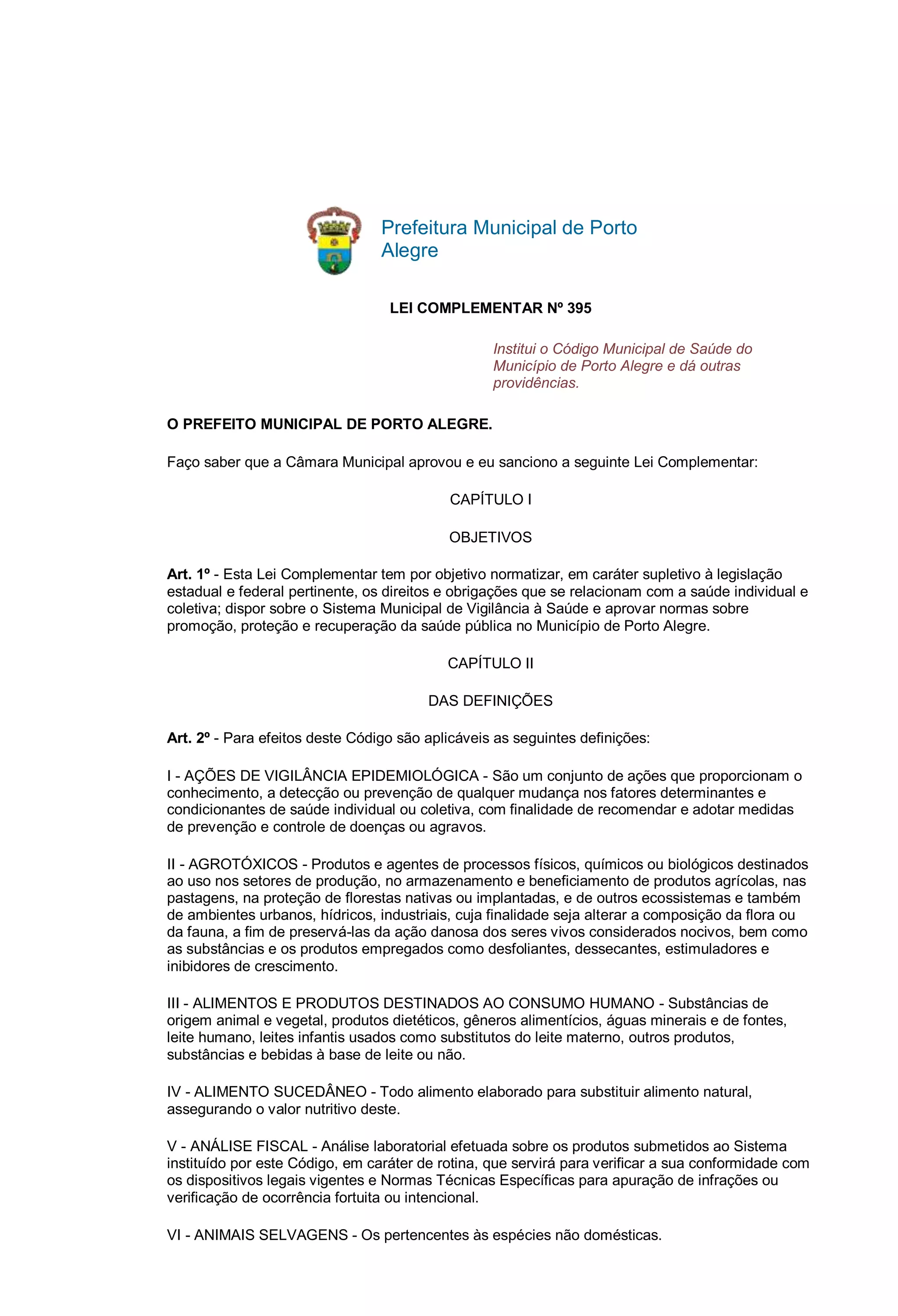 Este documento estabelece o Código Municipal de Saúde da cidade de Porto Alegre no Brasil. Ele define os objetivos do código como normatizar os direitos e obrigações relacionados à saúde individual e coletiva na cidade. O código também estabelece o Sistema Municipal de Vigilância à Saúde e normas sobre a promoção, proteção e recuperação da saúde pública. Ele fornece definições de termos técnicos relacionados à saúde e estabelece regras para estabelecimentos, produtos