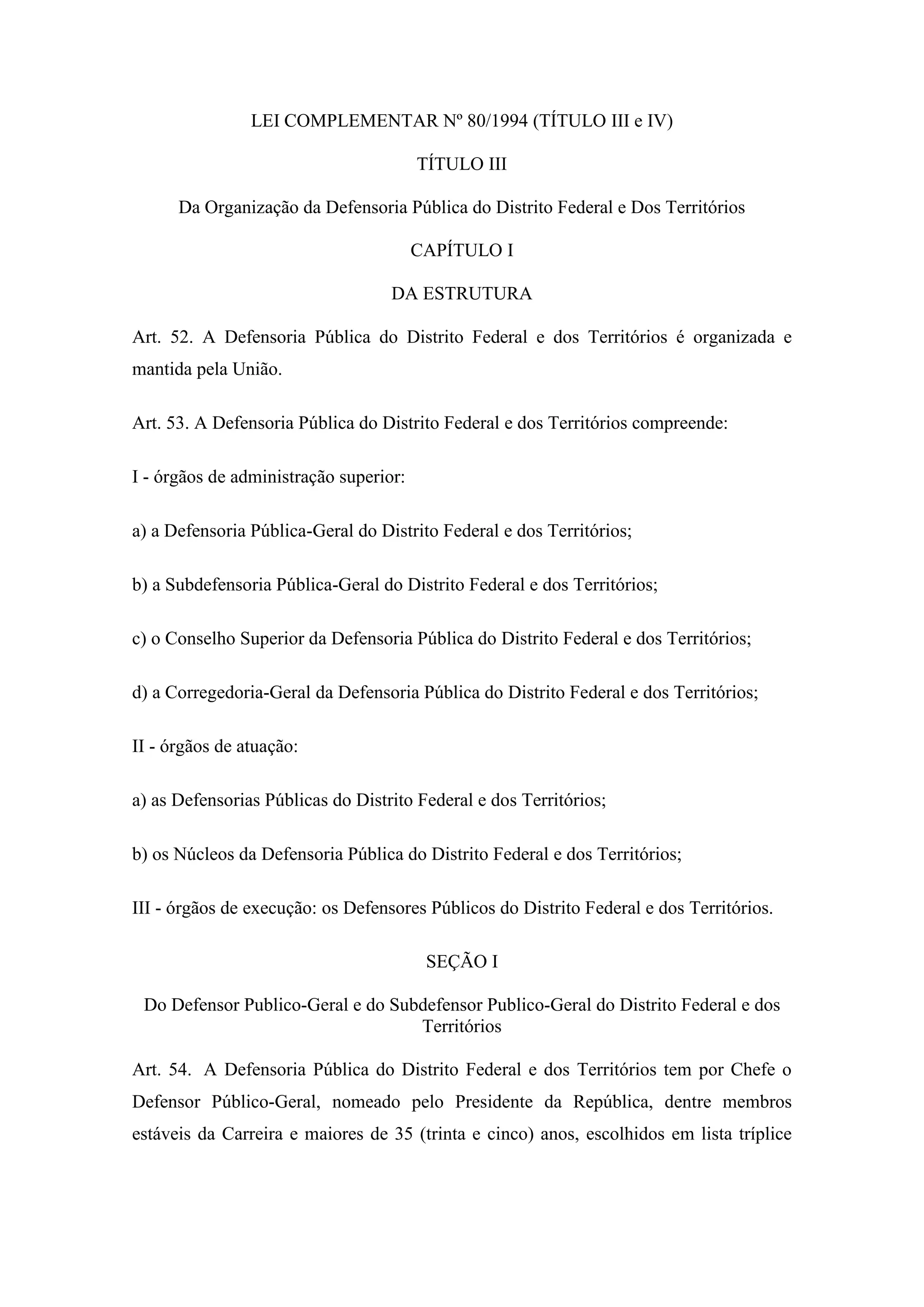 O documento descreve a estrutura e organização da Defensoria Pública do Distrito Federal e dos Territórios. A Defensoria é organizada em órgãos de administração superior, órgãos de atuação e órgãos de execução. O documento também define as atribuições do Defensor Público-Geral, do Subdefensor Público-Geral e do Conselho Superior da Defensoria Pública, entre outros órgãos.