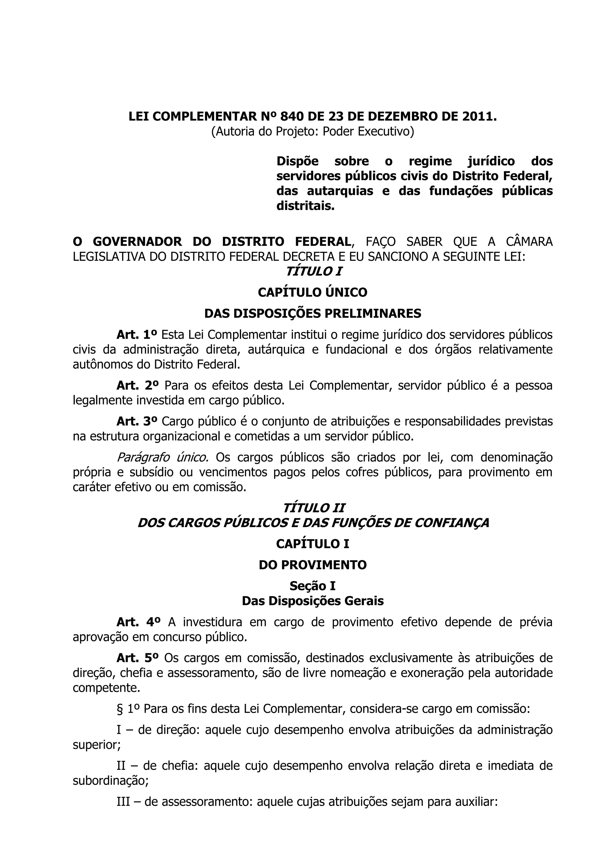 Esta lei complementar estabelece o regime jurídico dos servidores públicos civis do Distrito Federal, abordando tópicos como cargos públicos, provimento em cargo, concurso público, nomeação e posse. Ela define servidor público e cargo público, trata das formas de provimento, dos requisitos para investidura em cargo, e estabelece normas sobre concurso público, nomeação, posse e exercício de cargo.