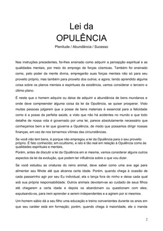 Este documento descreve a "Lei da Opulência", que afirma que todos podem atrair abundância e sucesso através do poder da mente. Explica que as pessoas evoluíram para além da necessidade de trabalho físico extenuante, e agora podem usar a mente para progredir em suas carreiras e finanças. Fornece exemplos de como a fé no poder da mente ajudou indivíduos a aumentar seu sucesso e riqueza.