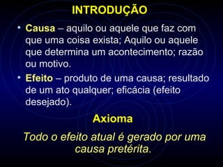 O documento discute a lei de causa e efeito segundo diferentes perspectivas religiosas e filosóficas. Aborda como conceitos como carma, destino e livre-arbítrio são vistos no hinduísmo, budismo, judaísmo, cristianismo e espiritismo. Explica que no espiritismo não há fatalidade, e que o objetivo das encarnações é levar o espírito à perfeição através da evolução, não do sofrimento.