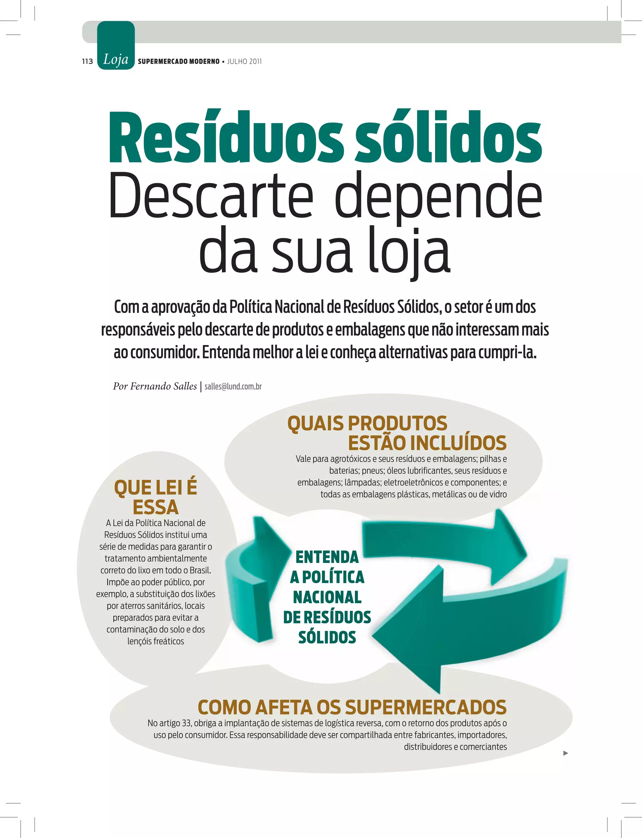 O documento aborda a Política Nacional de Resíduos Sólidos, que estabelece diretrizes para o descarte e tratamento ambientalmente responsável de resíduos no Brasil, afetando diretamente o setor supermercadista. A legislação impõe a responsabilidade pela logística reversa ao longo de toda a cadeia de produção, exigindo que supermercados adaptem suas operações para coletar e reciclar produtos e embalagens. Exemplos de iniciativas bem-sucedidas em supermercados como Walmart e Pão de Açúcar demonstram como a redução de resíduos e a reciclagem já estão sendo implementadas.