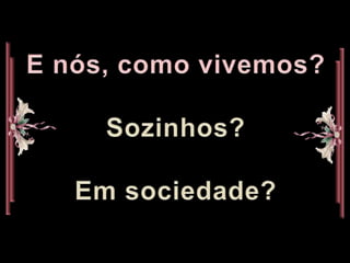 O documento discute a Lei da Sociedade segundo Allan Kardec. Ele afirma que Deus fez o homem para viver em sociedade e que, embora a vida isolada seja possível, é através da união social que os homens se completam e se desenvolvem. Contudo, a vida em sociedade também apresenta desafios como egoísmo e violência.