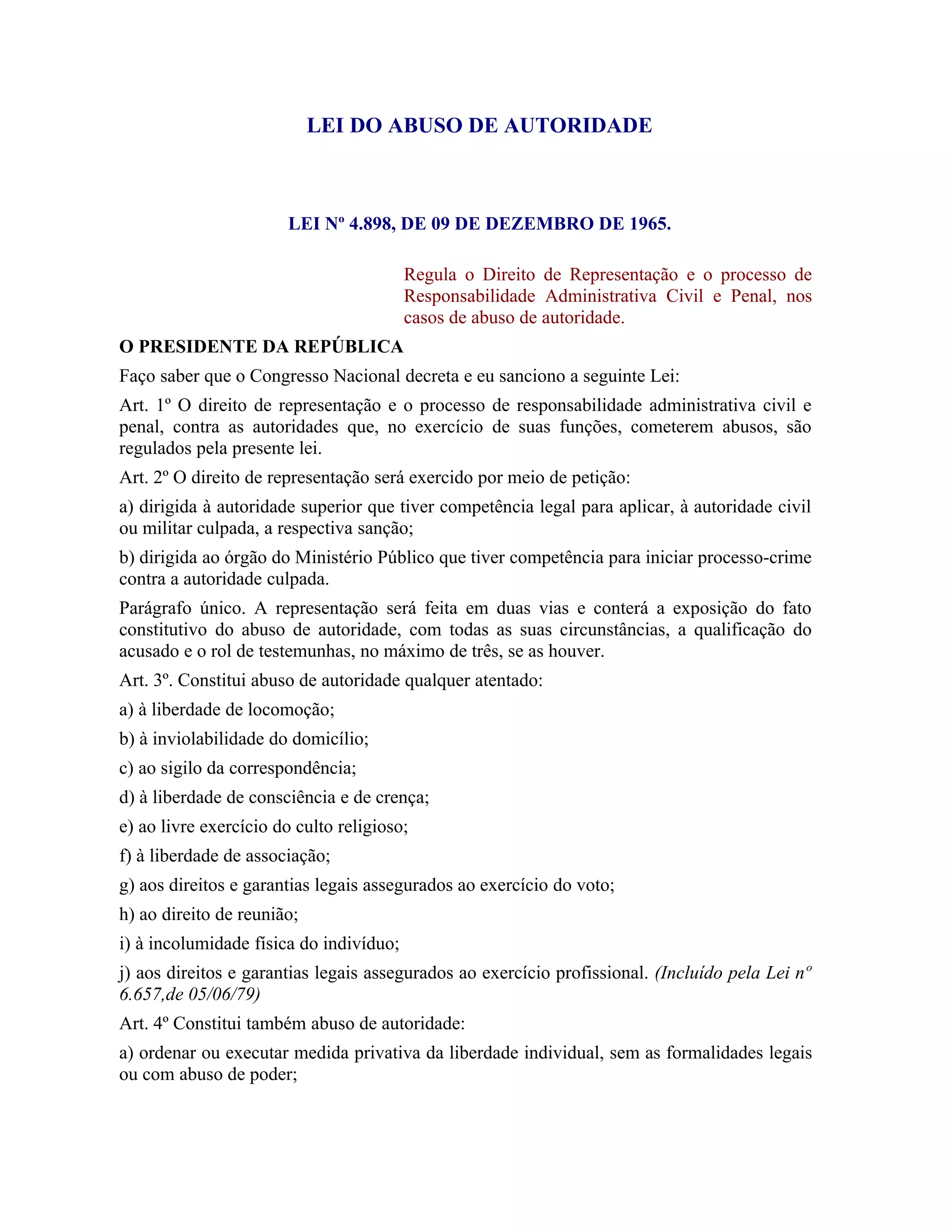 Esta lei regulamenta os casos de abuso de autoridade por funcionários públicos, definindo o que constitui abuso e estabelecendo sanções administrativas, civis e penais. Ela determina que representações de abuso devem ser encaminhadas às autoridades competentes e define os procedimentos para investigação e julgamento desses casos.