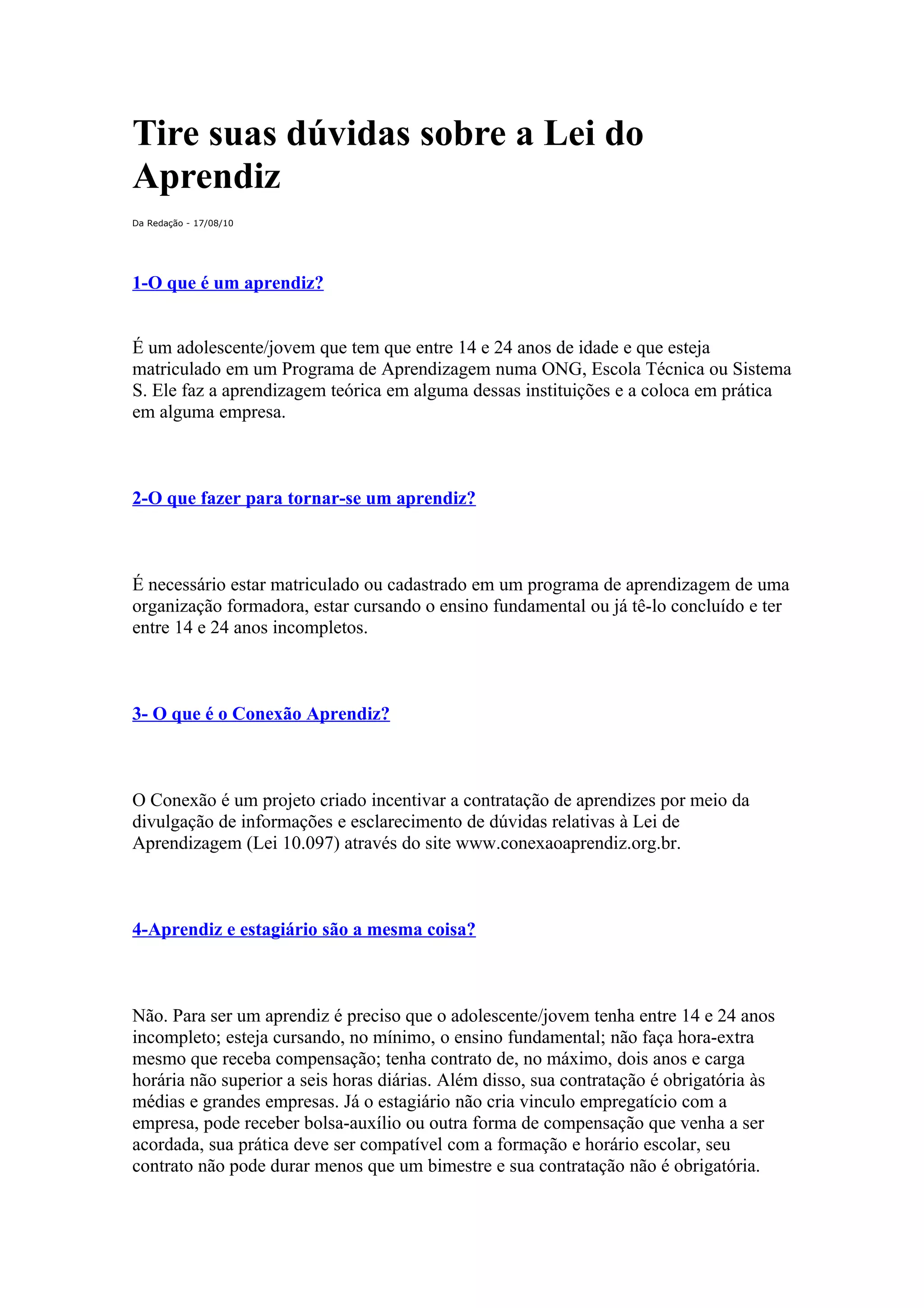 O documento explica os principais pontos da Lei do Aprendiz, incluindo que um aprendiz é um jovem entre 14 e 24 anos matriculado em um programa de aprendizagem profissional, as etapas para se tornar um aprendiz, e que as empresas de médio e grande porte são obrigadas a ter entre 5% a 15% de seus funcionários como aprendizes.