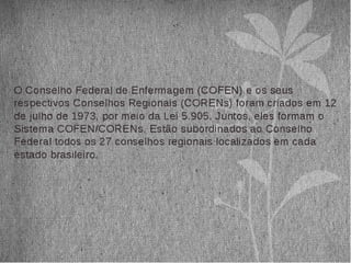 O documento descreve as atribuições do auxiliar de enfermagem, técnico de enfermagem e enfermeiro de acordo com a lei brasileira. O auxiliar de enfermagem executa tarefas auxiliares sob supervisão, como observação de sinais vitais e cuidados básicos de higiene. O técnico de enfermagem participa do planejamento dos cuidados e executa procedimentos, além de supervisionar auxiliares. Ao passo que o enfermeiro lidera a equipe, planeja os cuidados, realiza consultas